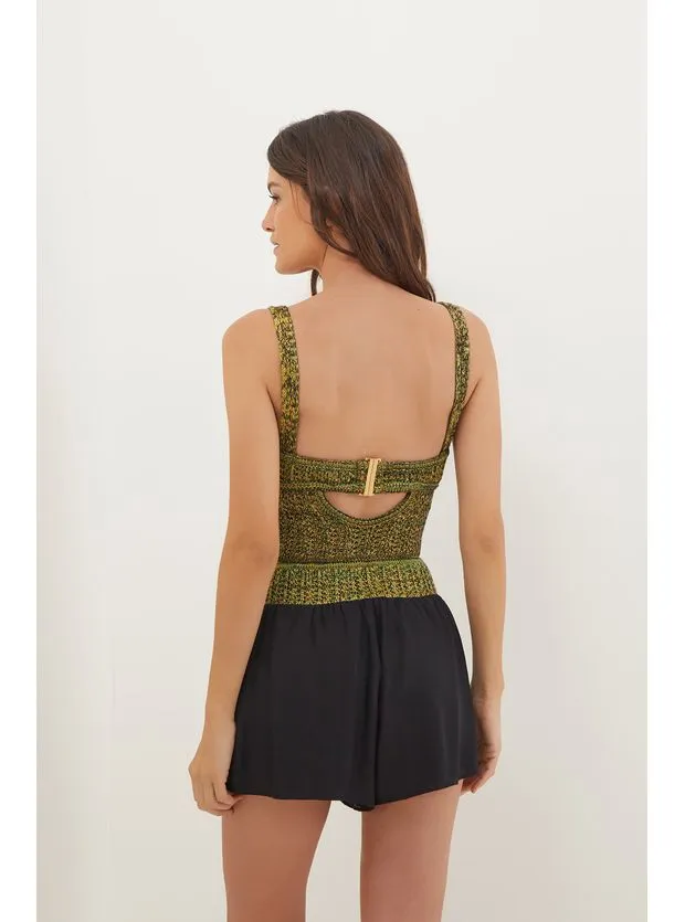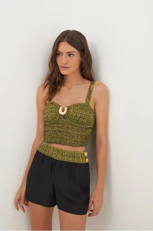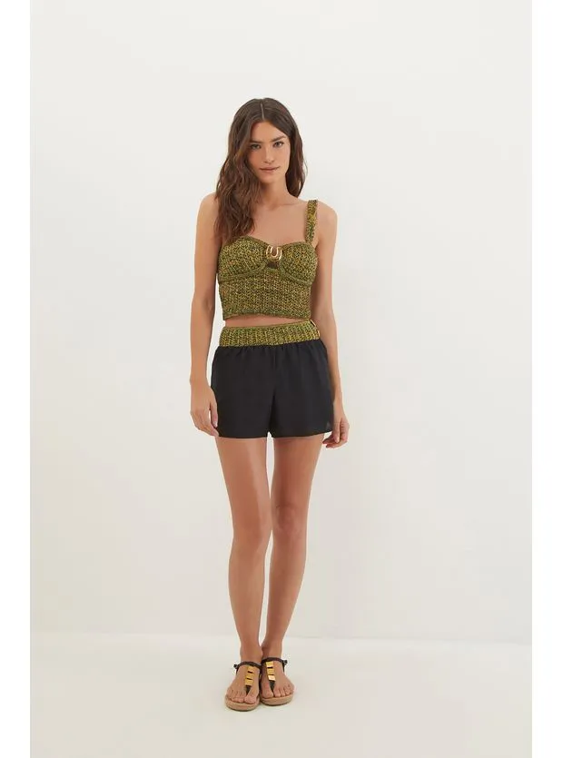 o short preto Kasey é uma peça versátil para combinar com camisas, batas ou tops da coleção. Experimente usá-lo com sandálias, bolsas e outros acessórios ViX. – Cós de tricot – Modelagem soltinha – Fechamento com ganchos ocultos na lateral – Detalhe em metal dourado – Possui forro Detalhes feitos à mão no ateliê ViX