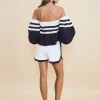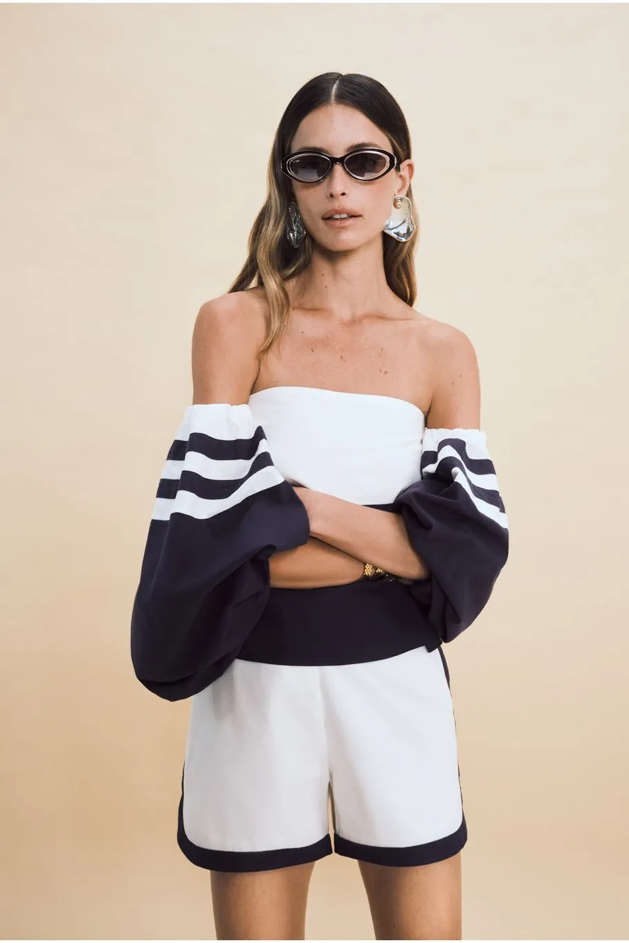 O short Marcele é confeccionado em tricoline. A peça off white apresenta modelagem solta e extremidades em azul marinho, proporcionando um visual clássico e no estilo navy. Possui comprimento curto, zíper e colchete embutido anterior e acabamento pespontado.