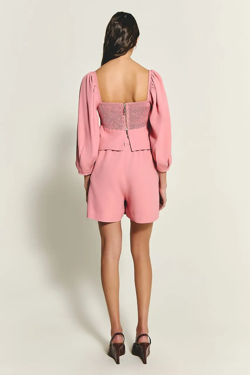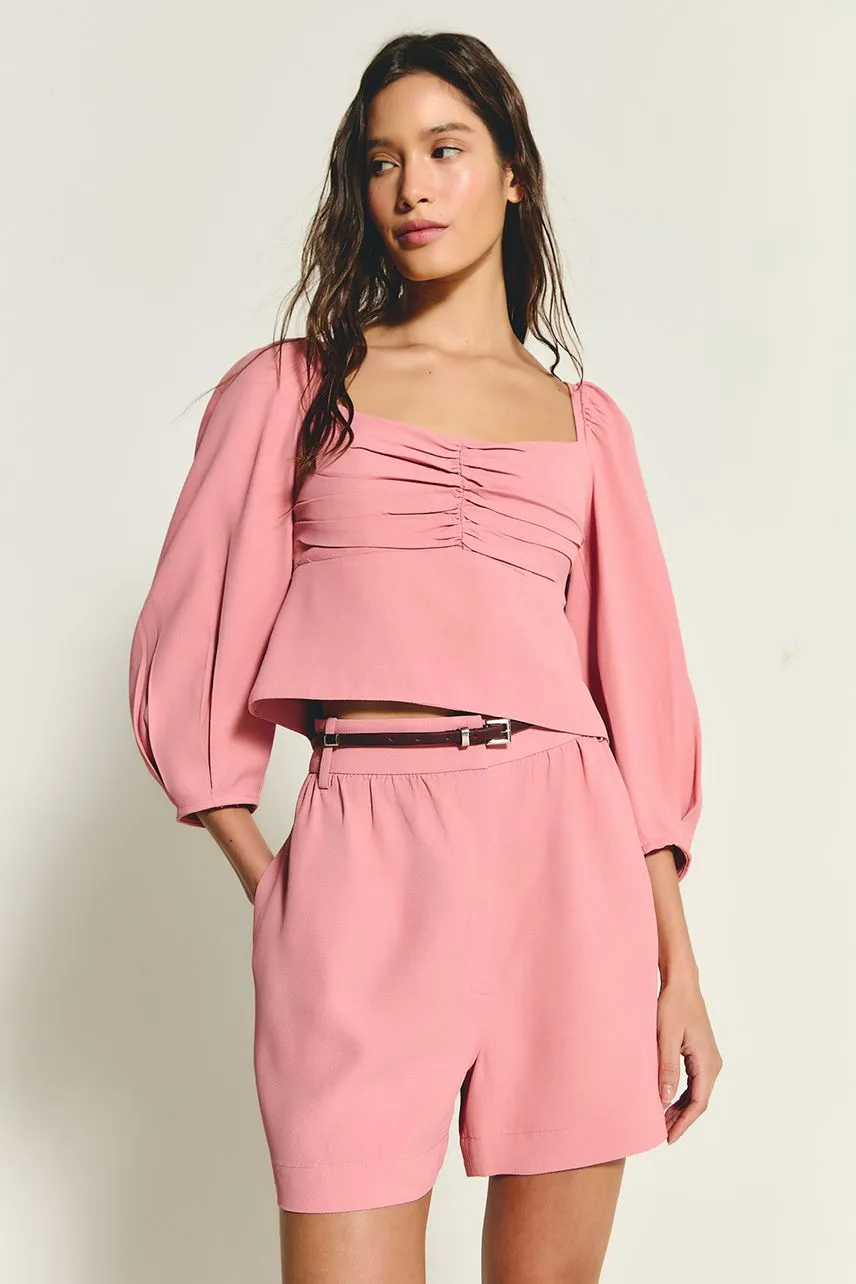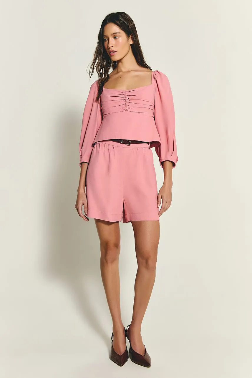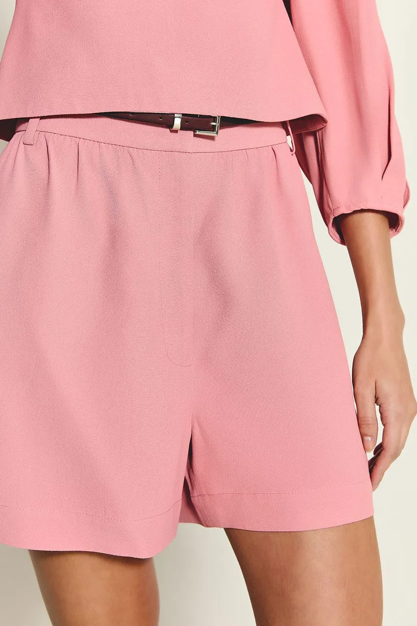 Shorts curto confeccionado em crepe de acetato com cintura média. Possui detalhe franzido abaixo do cós e fechamento por zíper e botão interno.