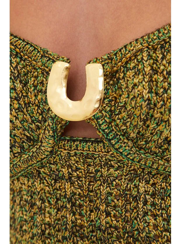 O top de tricot verde Aria é uma peça versátil que pode ser usada com shorts, calças ou saias da coleção. Experimente usá-lo com sandálias, bolsas e outros acessórios ViX. – Modelagem justa ao corpo – Detalhe formato U em metal dourado texturizado no centro do busto – Fecho de metal nas costas Detalhes feitos à mão no ateliê ViX e Leve e casual.