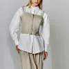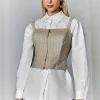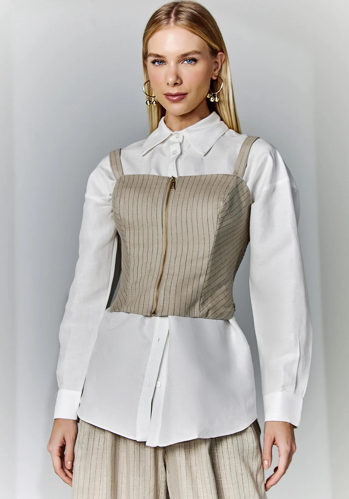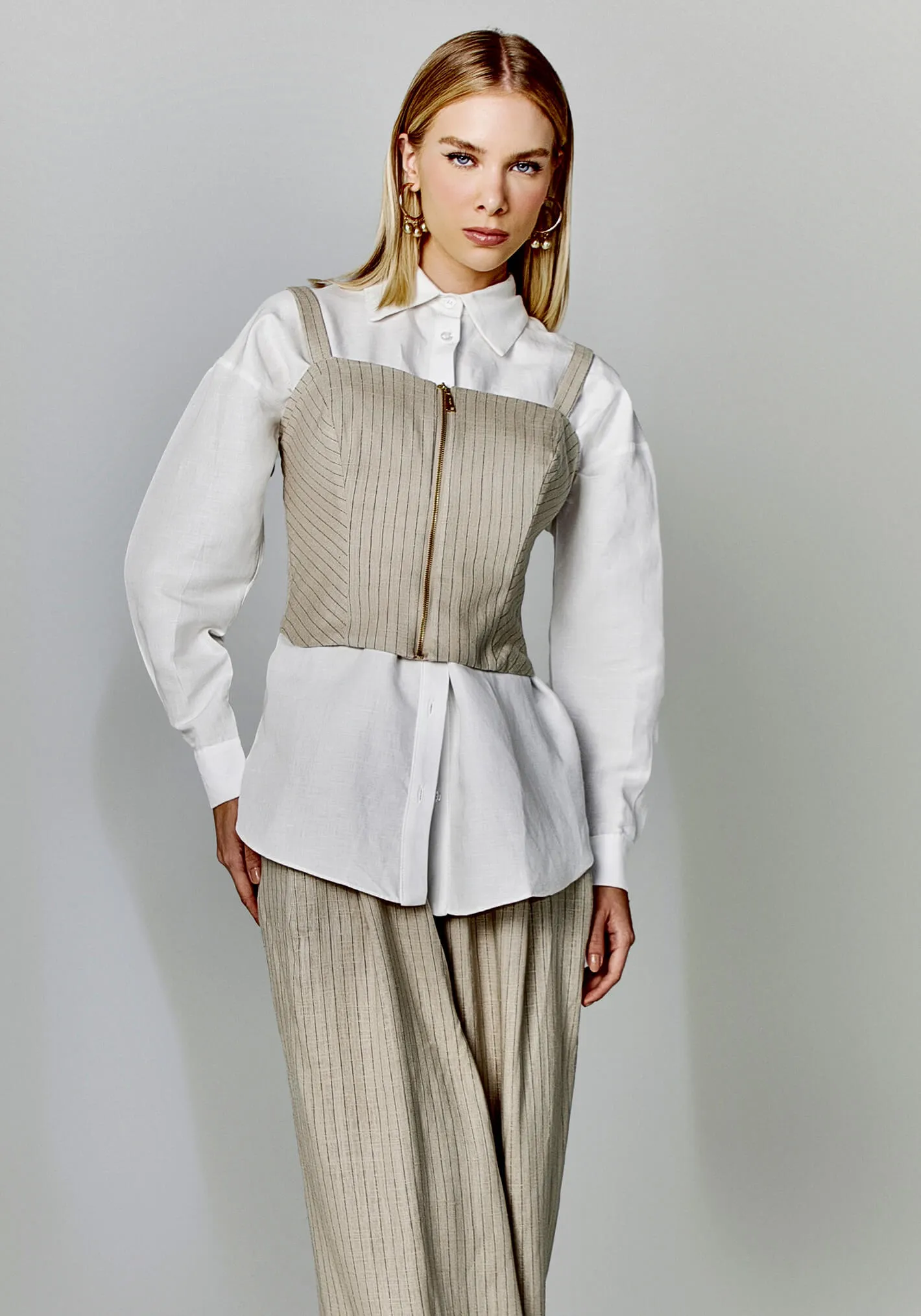 Explore a fusão entre modernidade e elegância com nosso top corselet. Este exuberante corselet, confeccionado em tecido leve e totalmente forrado, proporciona conforto sem abrir mão da sofisticação. Os detalhes de elastex nas laterais asseguram um ajuste perfeito, enquanto o zíper frontal em metal dourado, combinado com barbatanas para sustentação, oferece praticidade e estilo. As alças ajustáveis, adornadas com botões dourados nas costas, adicionam um toque refinado. Com uma modelagem certa ao corpo, o top exibe listras risca de giz, seguindo a tendência atual, e um comprimento ideal, consolidando-se como uma escolha sofisticada para realçar a feminilidade com um toque contemporâneo.