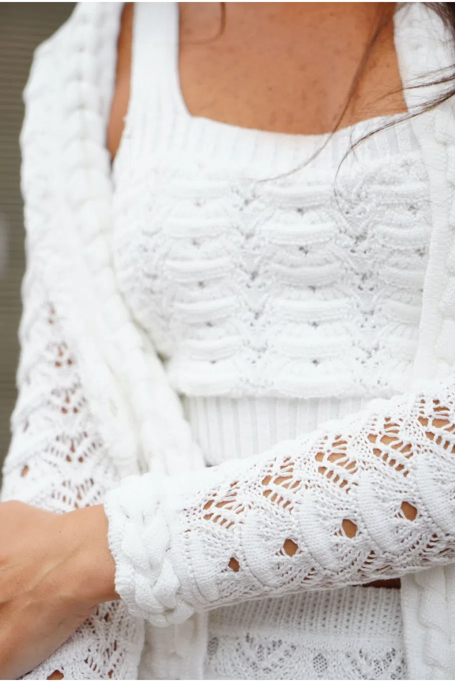 O top Eloise é confeccionado em tricot. A peça apresenta modelagem justa com vazados e texturas do próprio tricot, proporcionando um visual moderno e comfy. Possui comprimento de cropped, decote reto, alças de largura média e acabamento pespontado. É recomendado cuidado ao lavar a peça, por se tratar de um tecido delicado.
