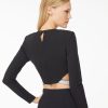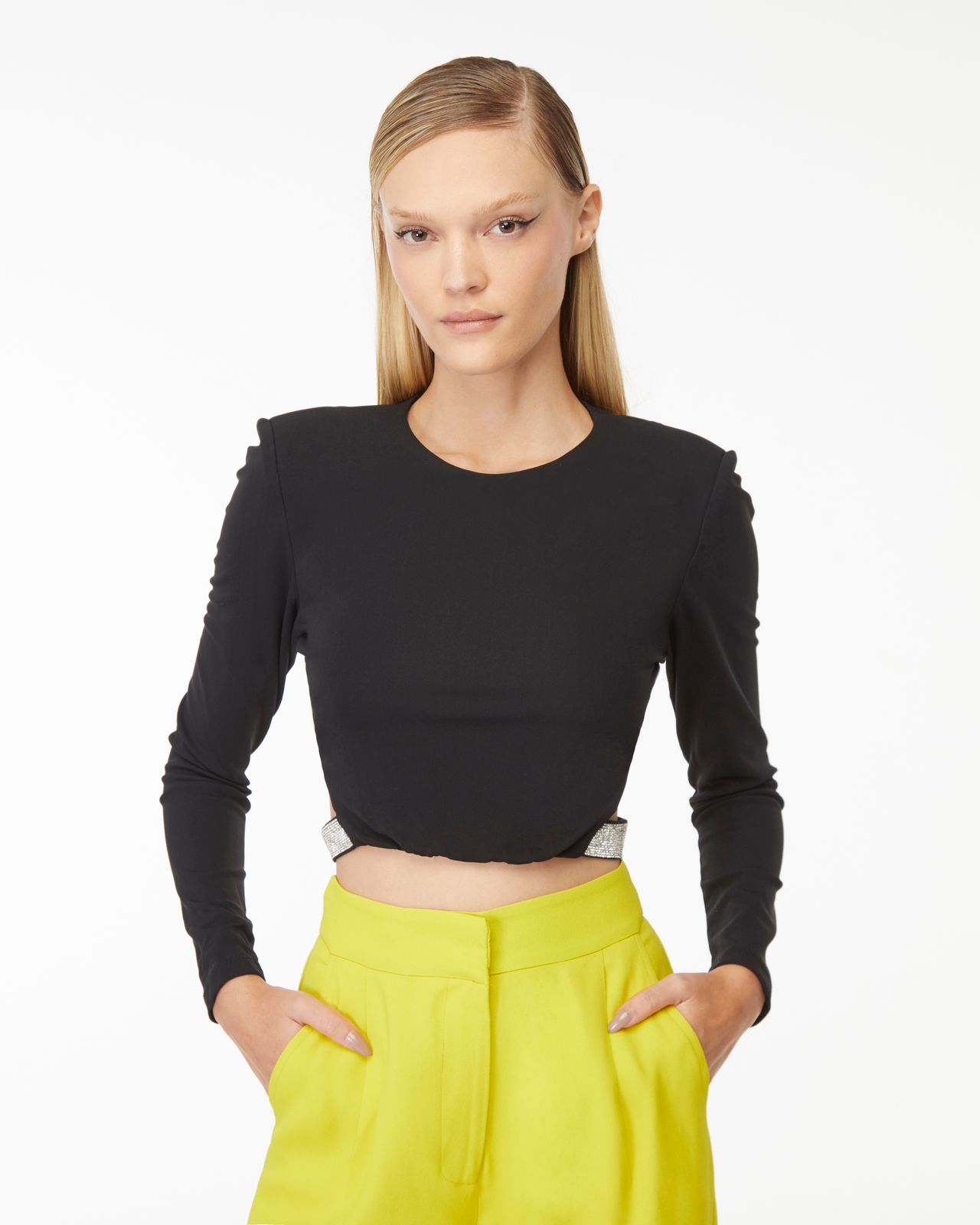 O top Harper é confeccionado em malha jersey. A peça apresenta modelagem justa com recortes cut out e faixa composta por strass cristral passando pela barra, proporcionando um visual moderno. Possui comprimento de cropped, mangas compridas, decote redondo, zíper invisível posterior com botão superior e acabamento pespontado. Peça com detalhes delicados, recomenda-se cuidado ao lavar.