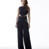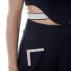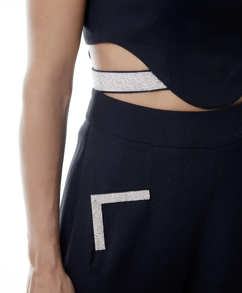 O top Harper é confeccionado em alfaiataria. A peça apresenta modelagem justa, decote redondo com cava desportiva, barra assimétrica com recorte cut out e faixa revestida por strass cristal, proporcionando um visual glamouroso e moderno. Possui comprimento de cropped, forro embutido, zíper invisível posterior com botão forrado superior e acabamento pespontado.