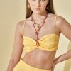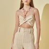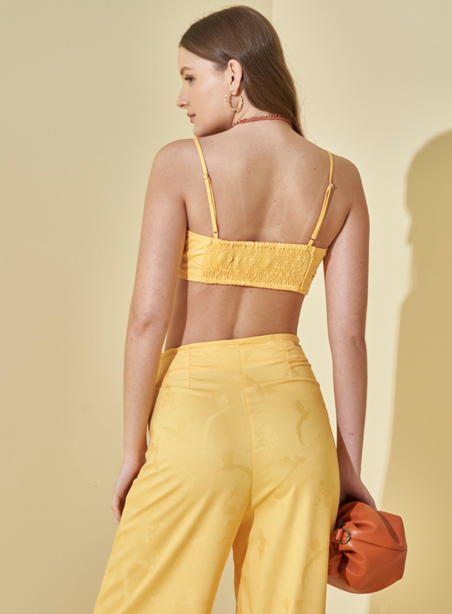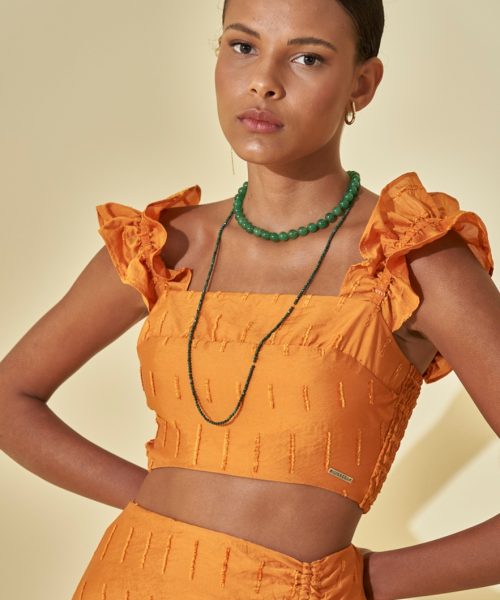 A peça possui busto com aberturas foradas, entrelaçando o lado direito com o esquerdo formando um detalhe torcido, comprimento cropped, shape justo e alças finas embutidas no decote com regulador em argola.