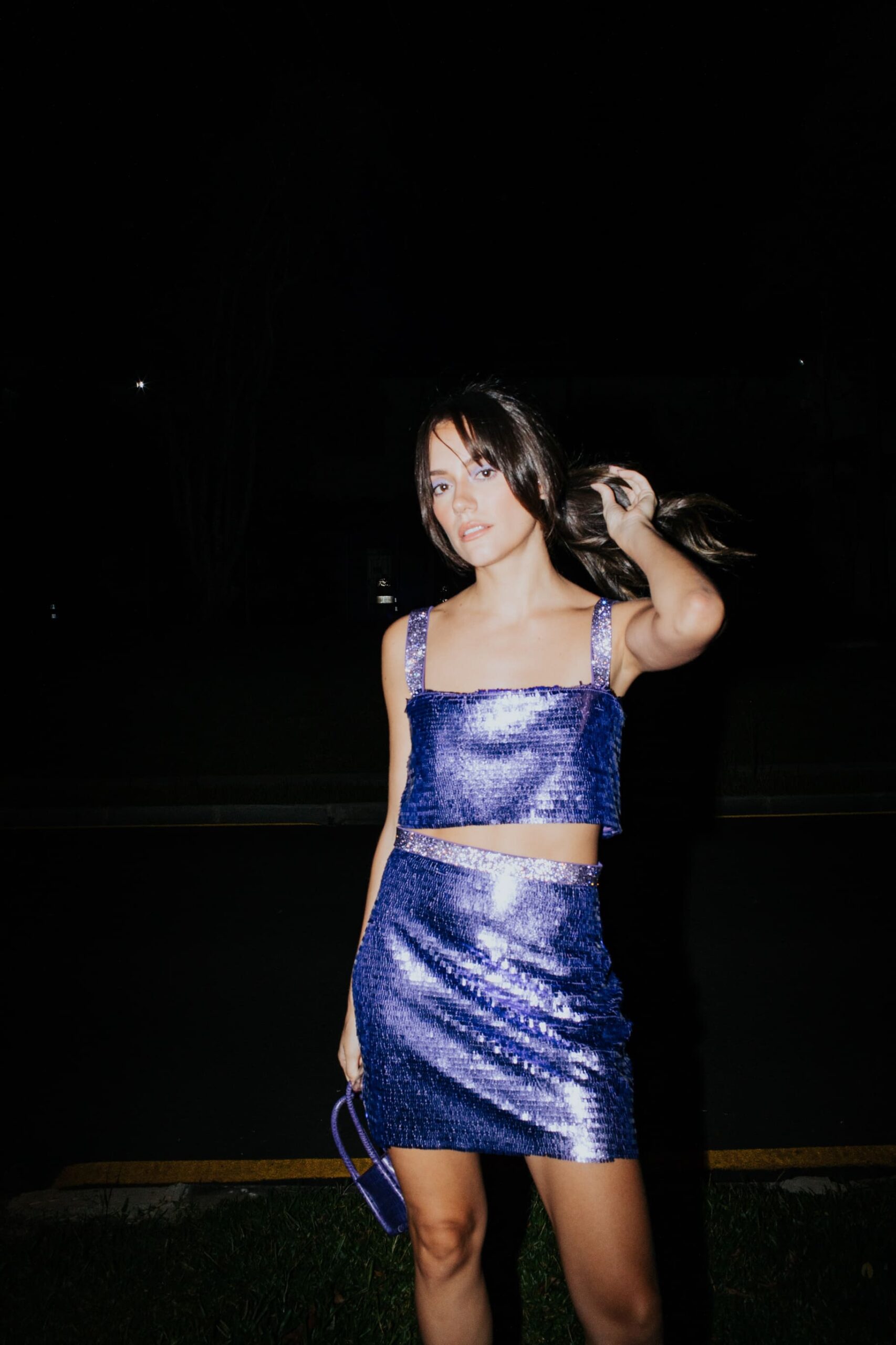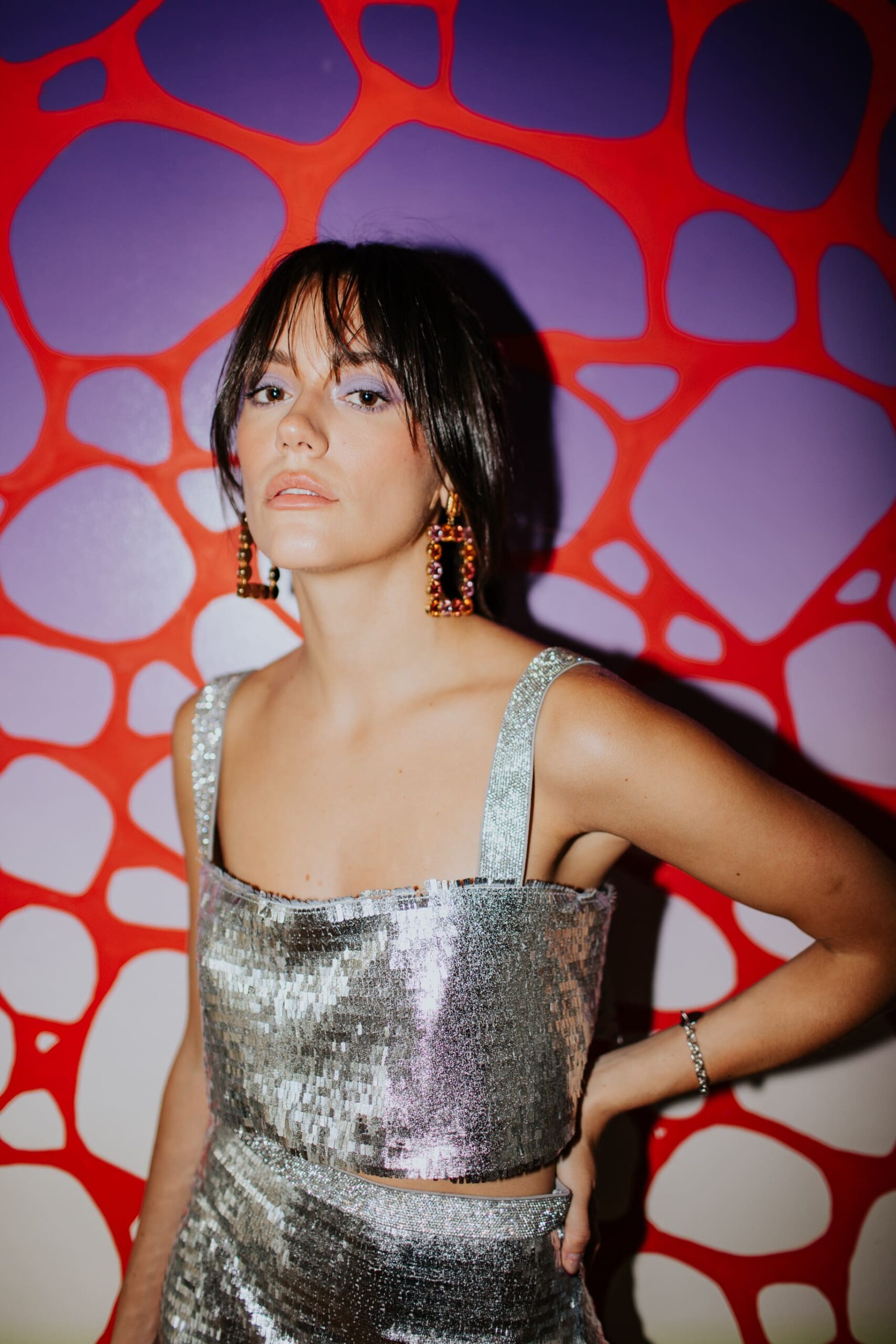 O top Jane é confeccionado em paetê. A peça apresenta modelagem solta, contando com uma base justa de acetato no interior, decote reto, alças de largura média com aviamento composto por strass cristal, proporcionando um visual glamouroso e fashionista. Possui comprimento cropped, zíper de metal posterior e acabamento pespontado.