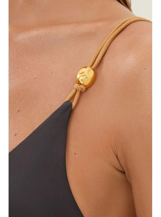detalhe Nancy combina delicadamente esferas e barretas em shape orgânico em metal dourado.