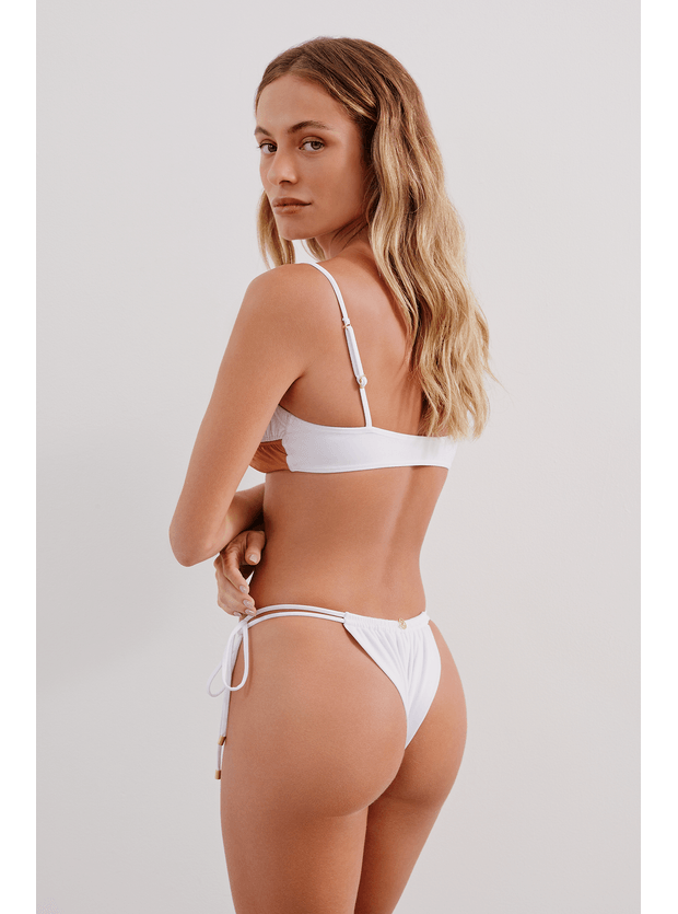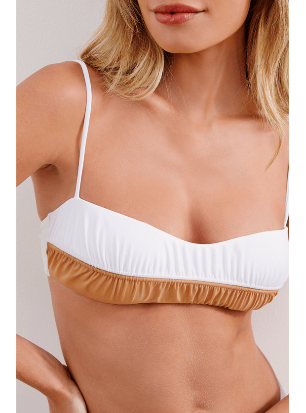 Top bandeau bicolor com recorte franzido no centro do busto. Alças paralelas e reguláveis, bojo removível, cobertura média.
