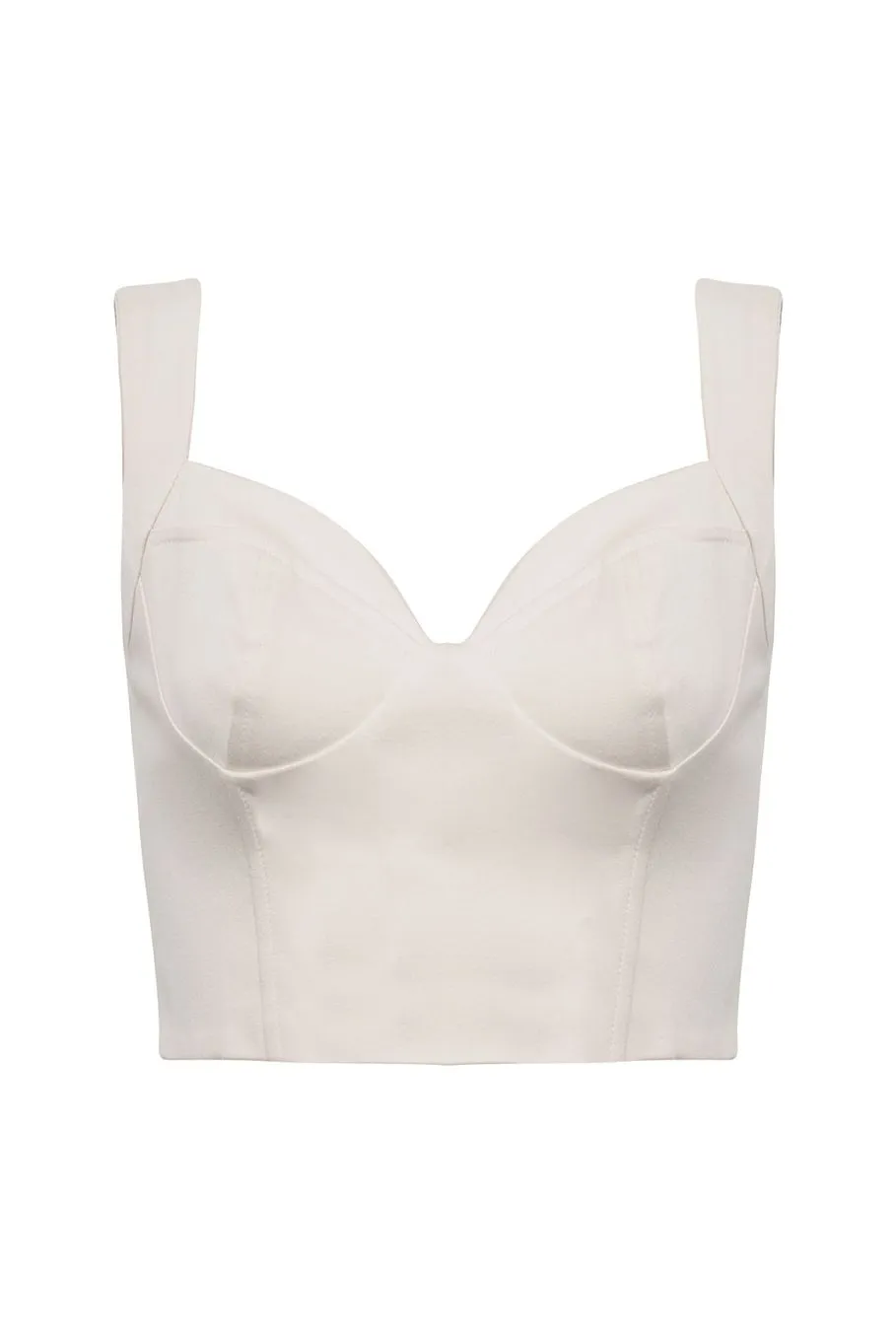 O top Lidia é confeccionado em sarja. A peça apresenta modelagem justa de corset e decote coração, proporcionando um visual moderno. Possui comprimento de cropped, seios estruturados, alças mais grossas, acabamento pespontado e zíper de metal posterior.