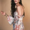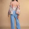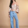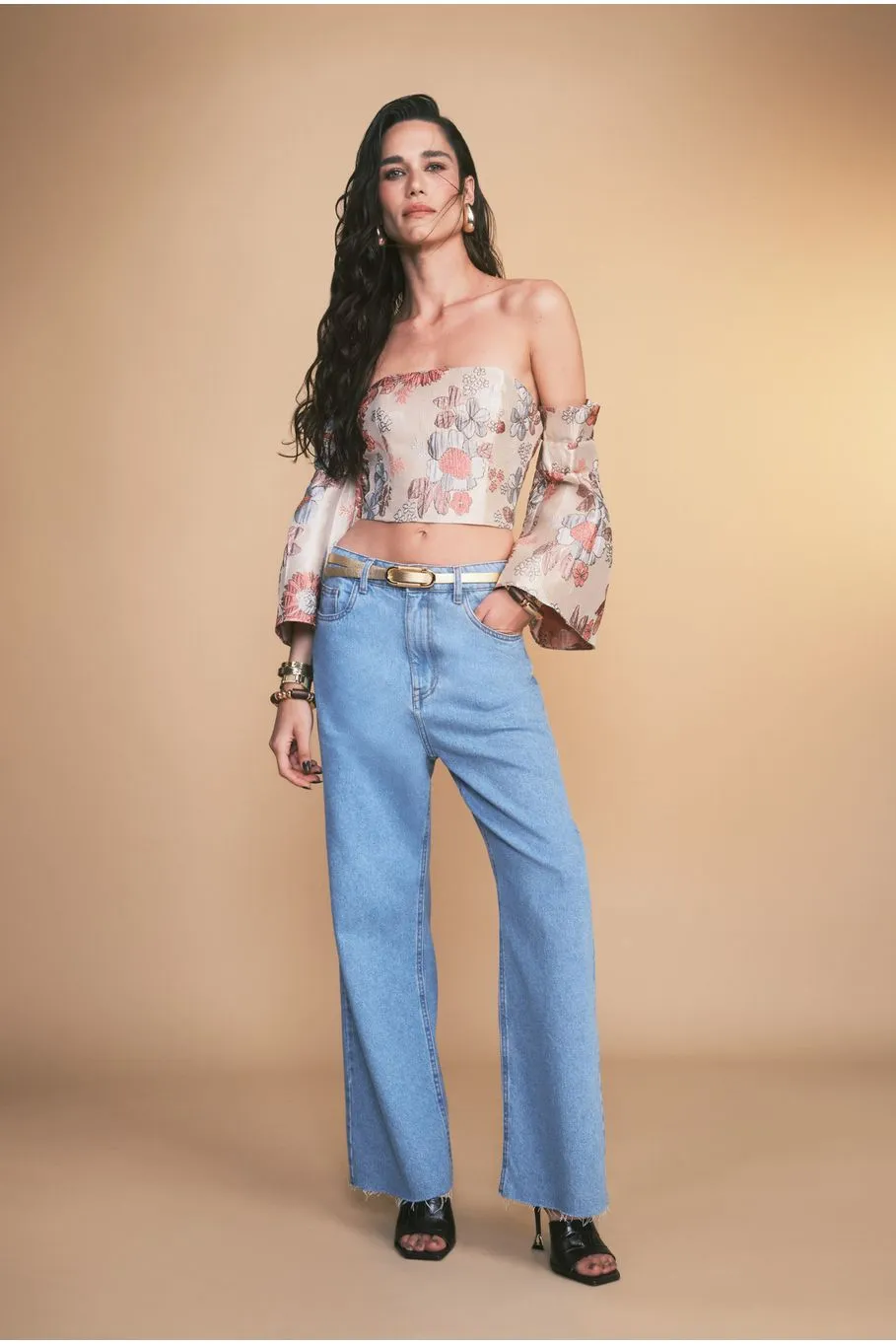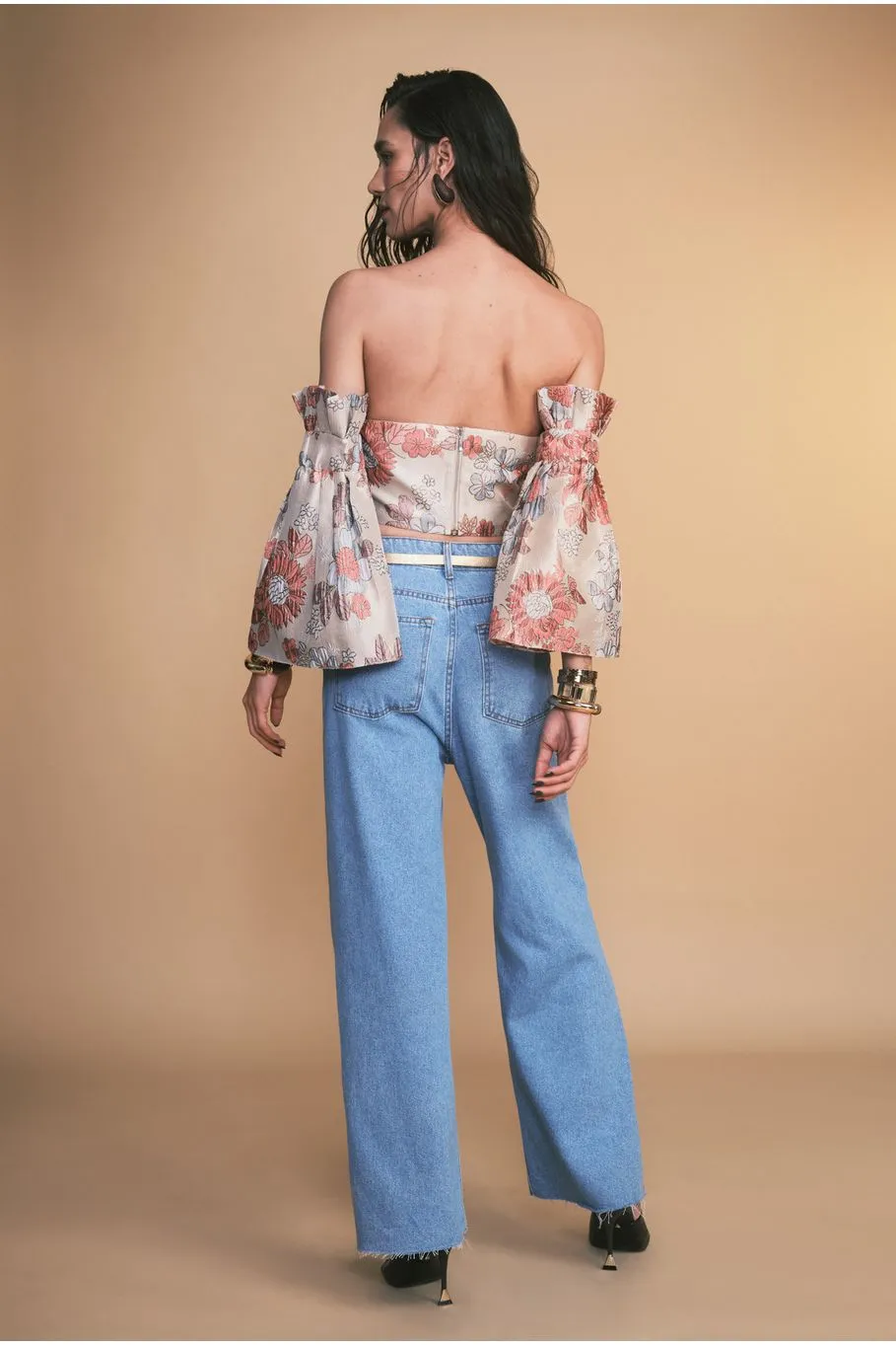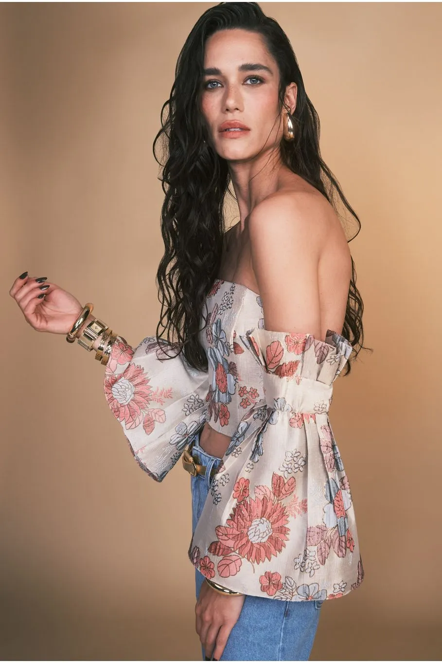 O top Lili é confeccionado em brocado floral. A peça em brocado floral apresenta modelagem justa no estilo corselet, decote reto e mangas bufantes removíveis, proporcionando um visual romântico e moderno.