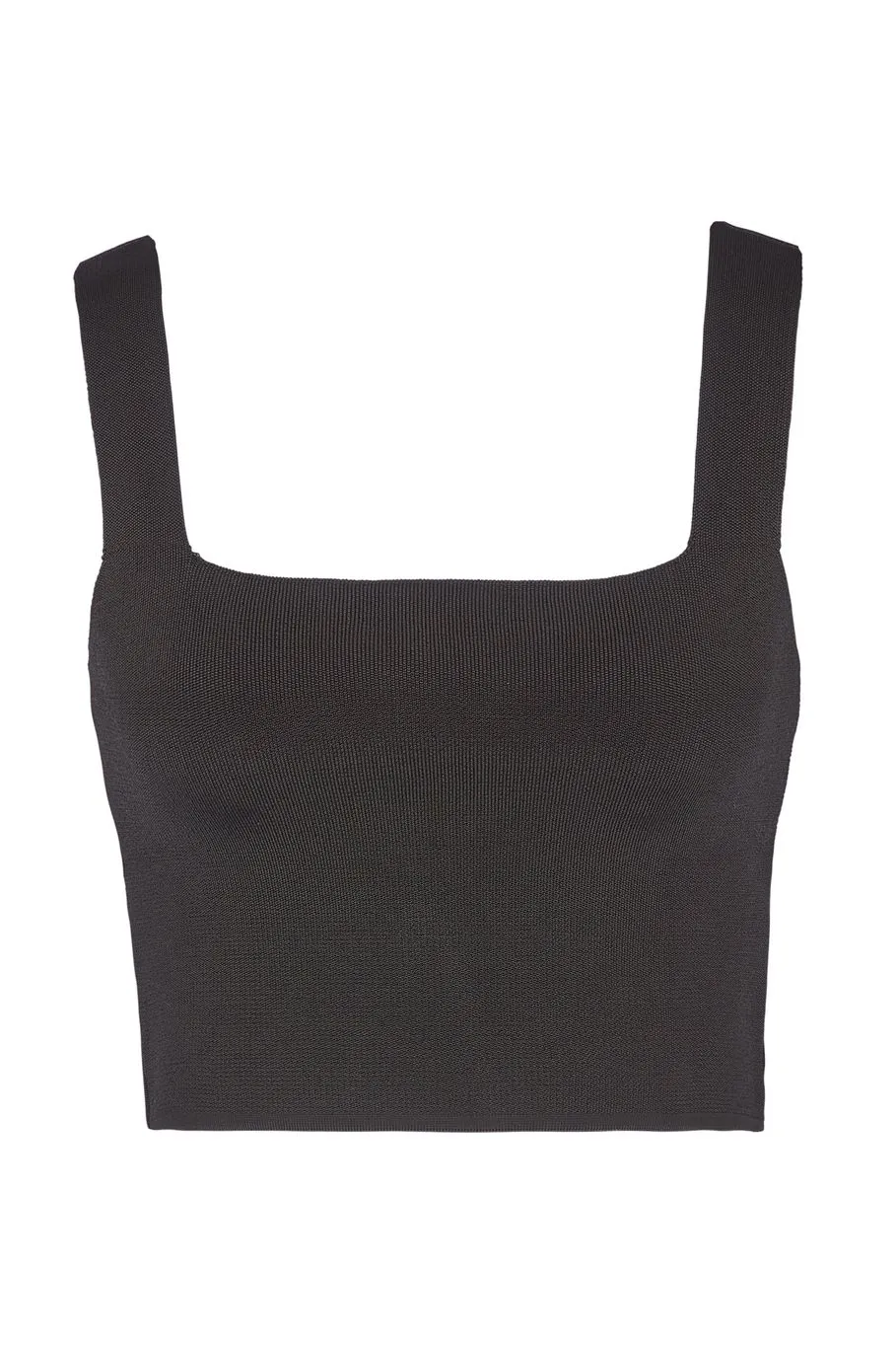 O top lola preto é confeccionado em tricot. A peça apresenta comprimento em cropped, decote quadrado e alças largas.