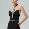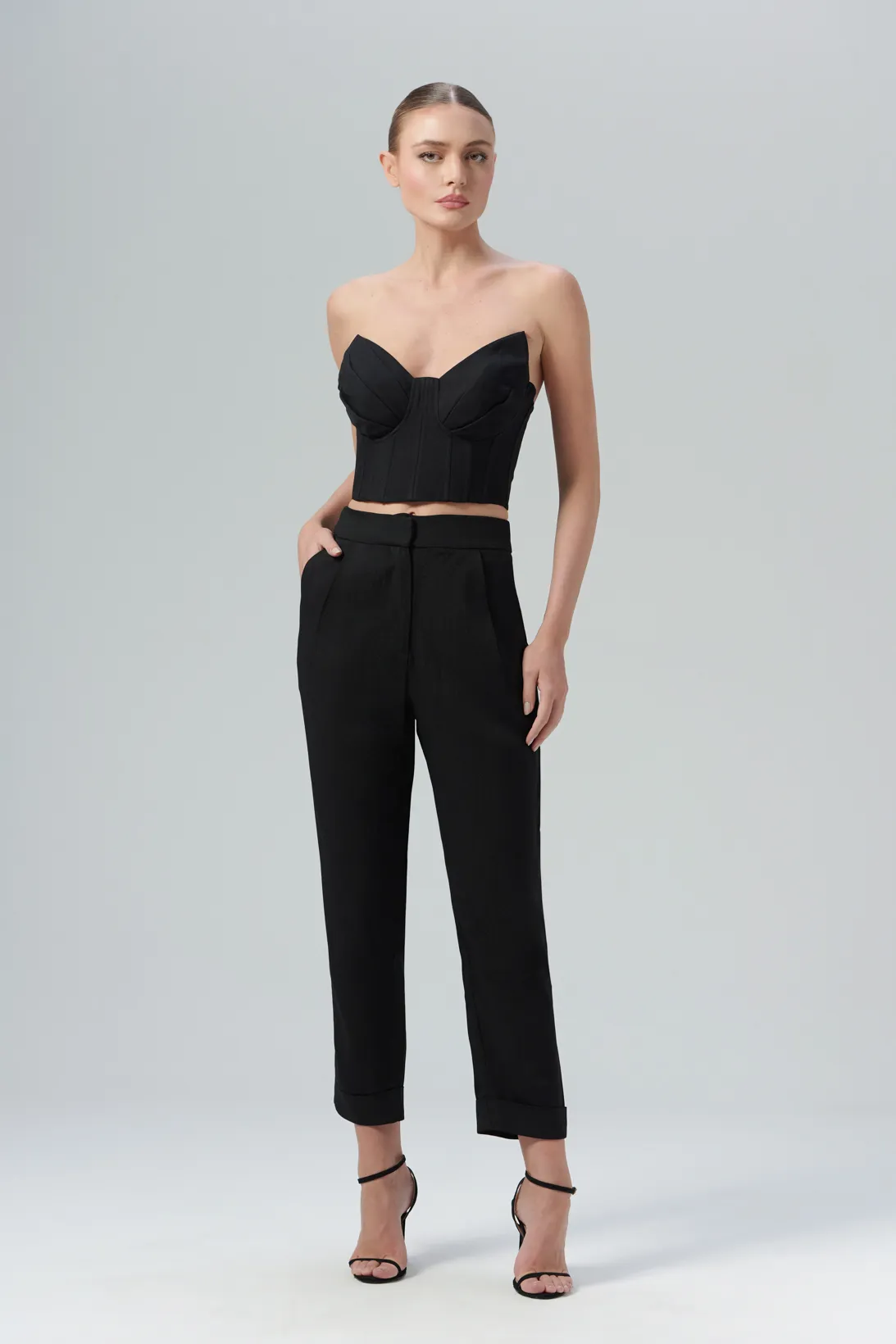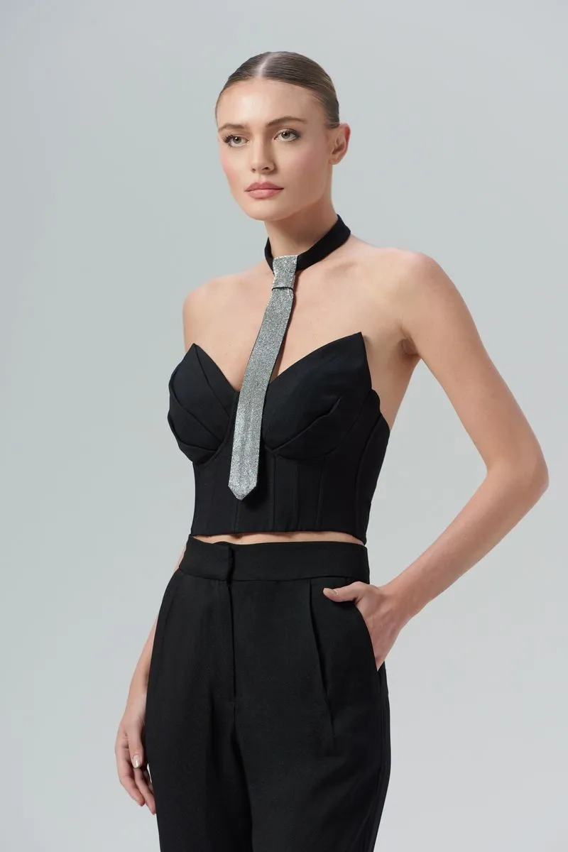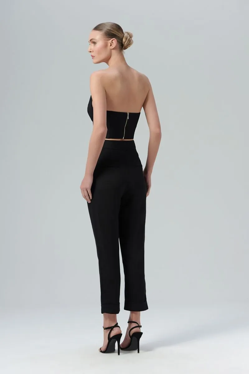 O top Olivia é confeccionado em alfaiataria. A peça apresenta modelagem justa com decote assimétrico no estilo strapless, proporcionando um visual fashion e moderno. Possui comprimento de cropped, estruturas de corset, zíper de metal posterior, forro embutido e acabamento pespontado.
