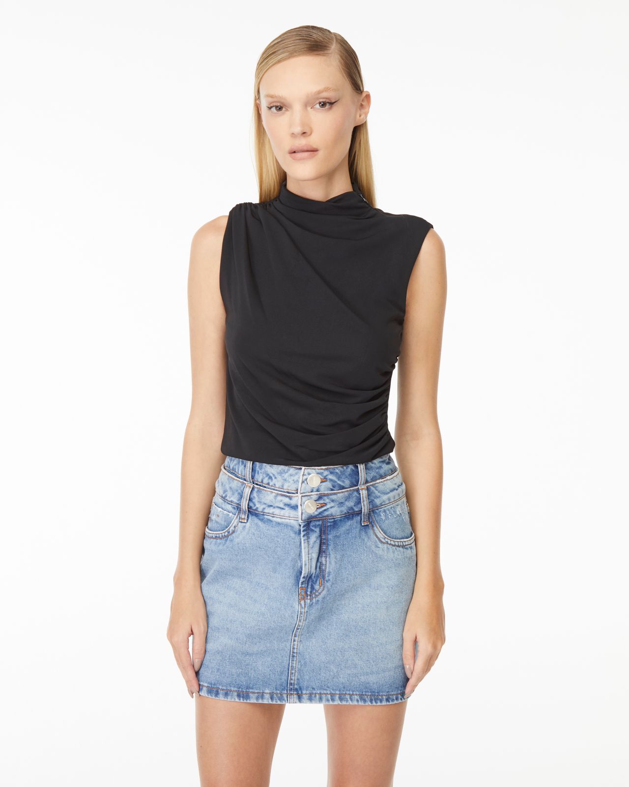 O top Sunny é confeccionado em malha jersey. A peça apresenta modelagem solta, gola rolê, drapeado no ombro e na lateral, proporcionando um visual moderno. Possui comprimento de cropped, forro embutido, zíper invisível no ombro, cava estilo regata e acabamento pespontado.