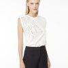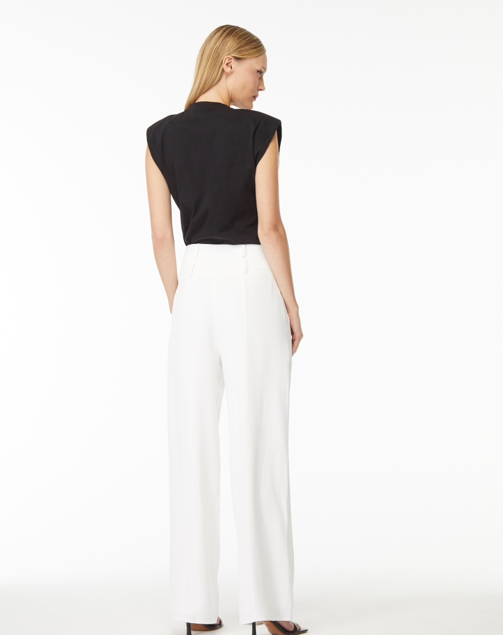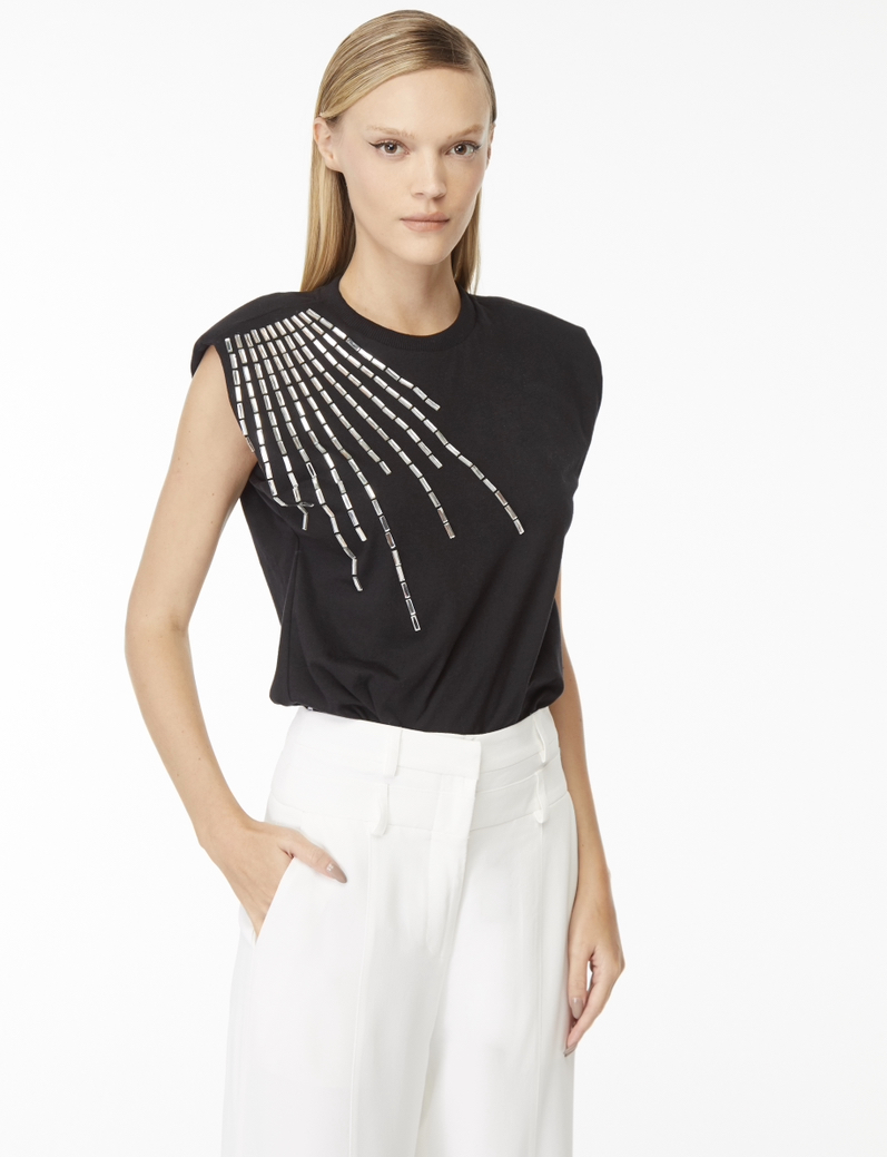 A t-shirt Ella é confeccionada em malha. A peça apresenta modelagem básica com aplicações em cristais no ombro, no estilo muscle tee, proporcionando um visual clássico e fashion. Possui decote redondo, drámaticas ombreiras, comprimento tradicional e acabamento pespontado. Peça com detalhes delicados, recomenda-se cuidado ao lavar.