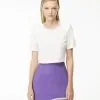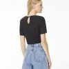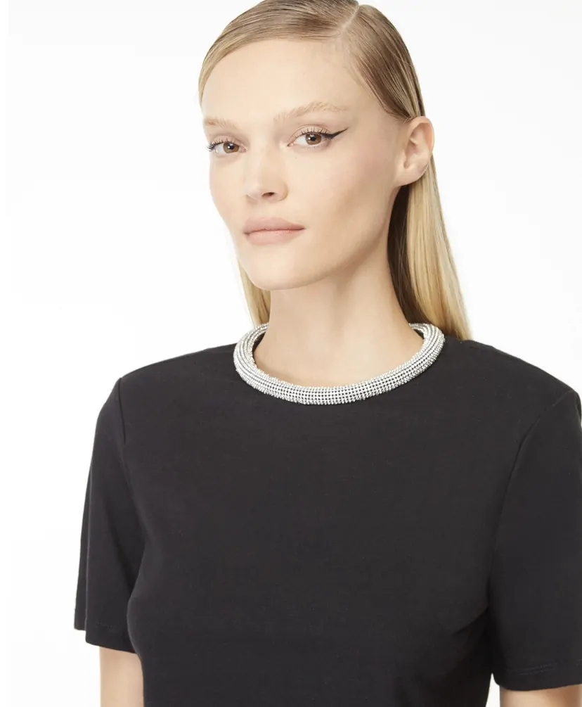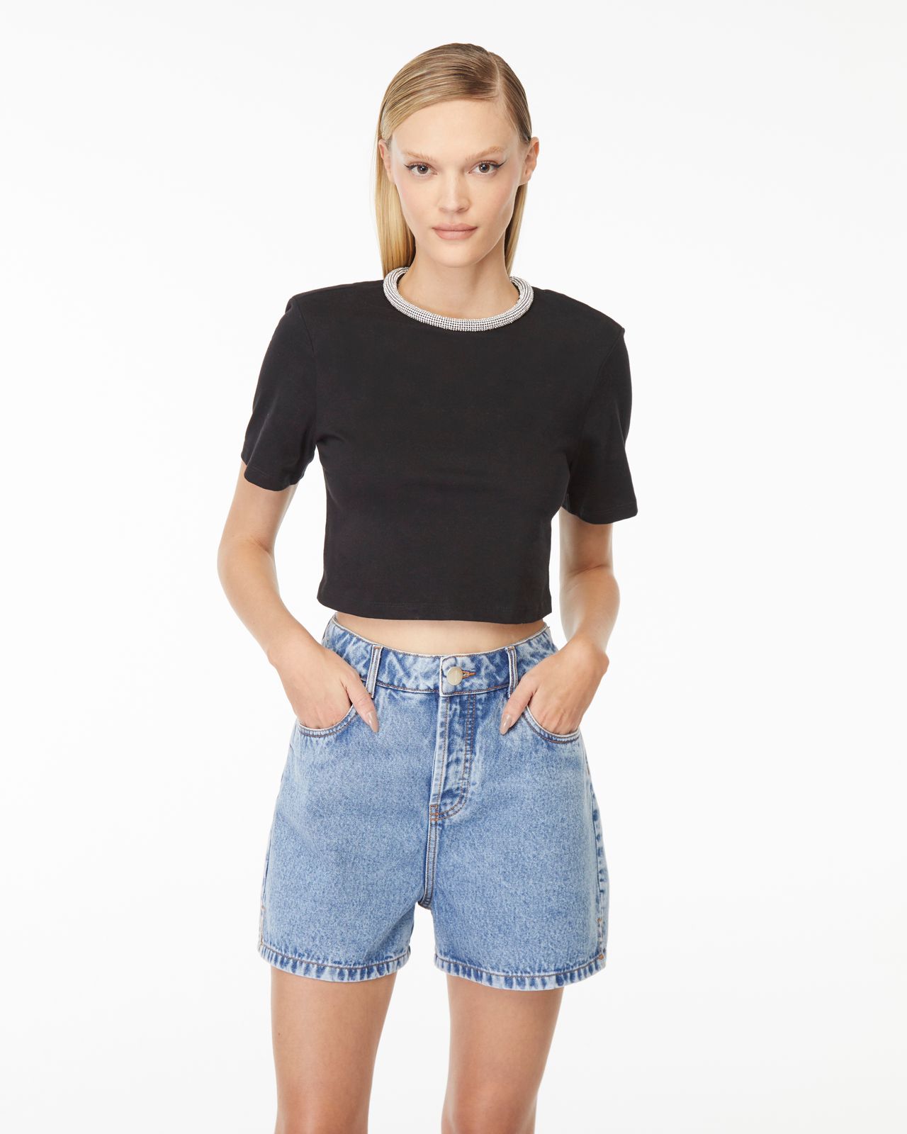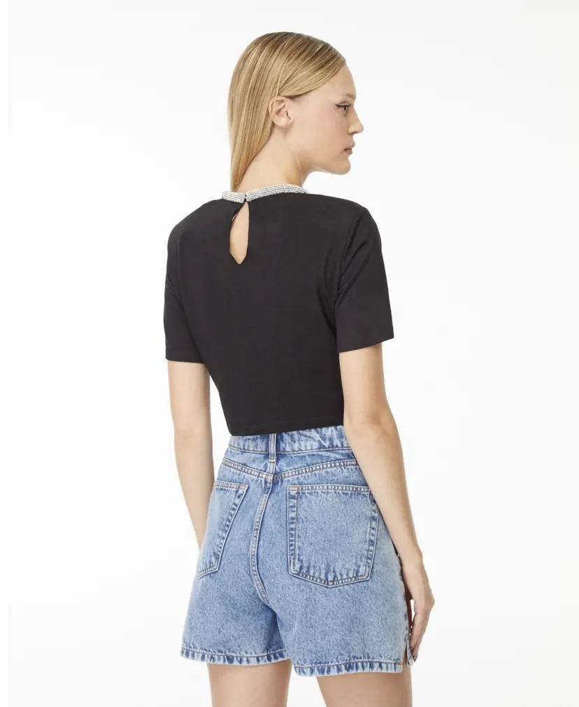 A t-shirt Lexie é confeccionada em malha. A peça apresenta modelagem solta e decote redondo com detalhe em strass cristal no decote, proporcionando um visual cool and glamouroso. Possui comprimento cropped, mangas curtas com ombreiras, fechamento por colchete posterior e acabamento pespontado. Peça com detalhes delicados, recomenda-se cuidado ao lavar.