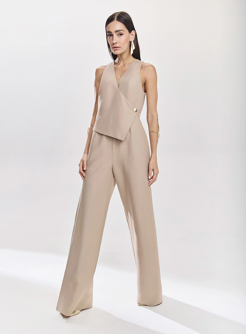 O Macacão Ella Bege confeccionado em Linho Ella, uma composição de linho e viscose de peso médio, essa peça oferece o equilíbrio ideal entre leveza e estrutura proporcionando um caimento impecável e sensação de liberdade ao vestir. Com modelagem reta e alongada, o macacão valoriza a silhueta de forma sofisticada e atemporal. O grande destaque é a parte frontal transpassada com recorte assimétrico que cria um visual contemporâneo e refinado. O detalhe do botão metalizado liso finaliza o design com um toque de brilho sutil e elegante.