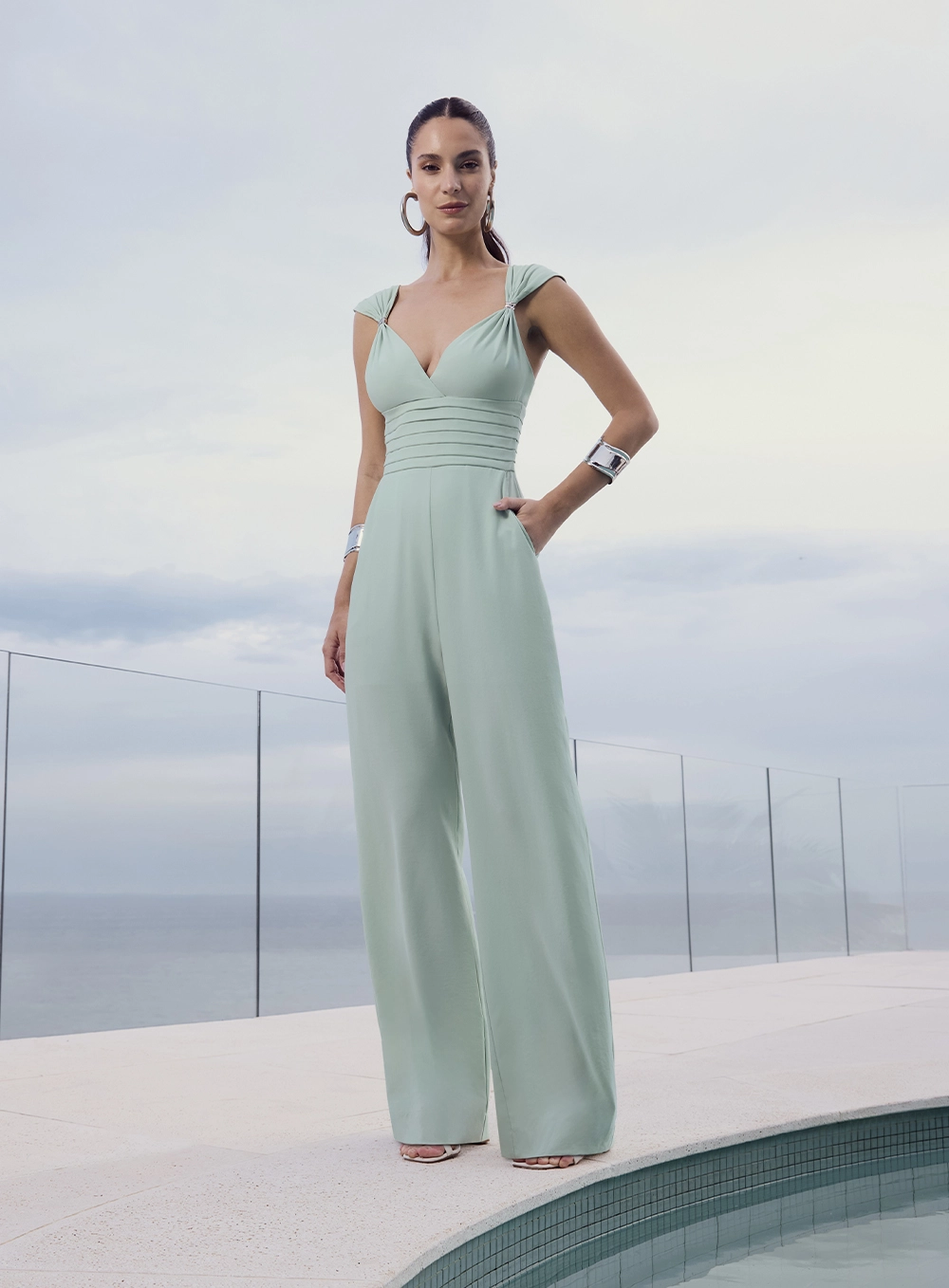 Confeccionado em crepe de aspecto nobre, este macacão proporciona um visual refinado e um toque suave. O decote em V confere um toque de feminilidade discreta, enquanto as alças ajustáveis por um detalhe metálico adicionam um toque de modernidade e personalização. As pregas no corpinho são estrategicamente posicionadas para valorizar a forma, e os bolsos laterais oferecem funcionalidade sem comprometer a linha limpa da peça. O fechamento por zíper visível na parte posterior é um detalhe de design contemporâneo que complementa o estilo da peça.