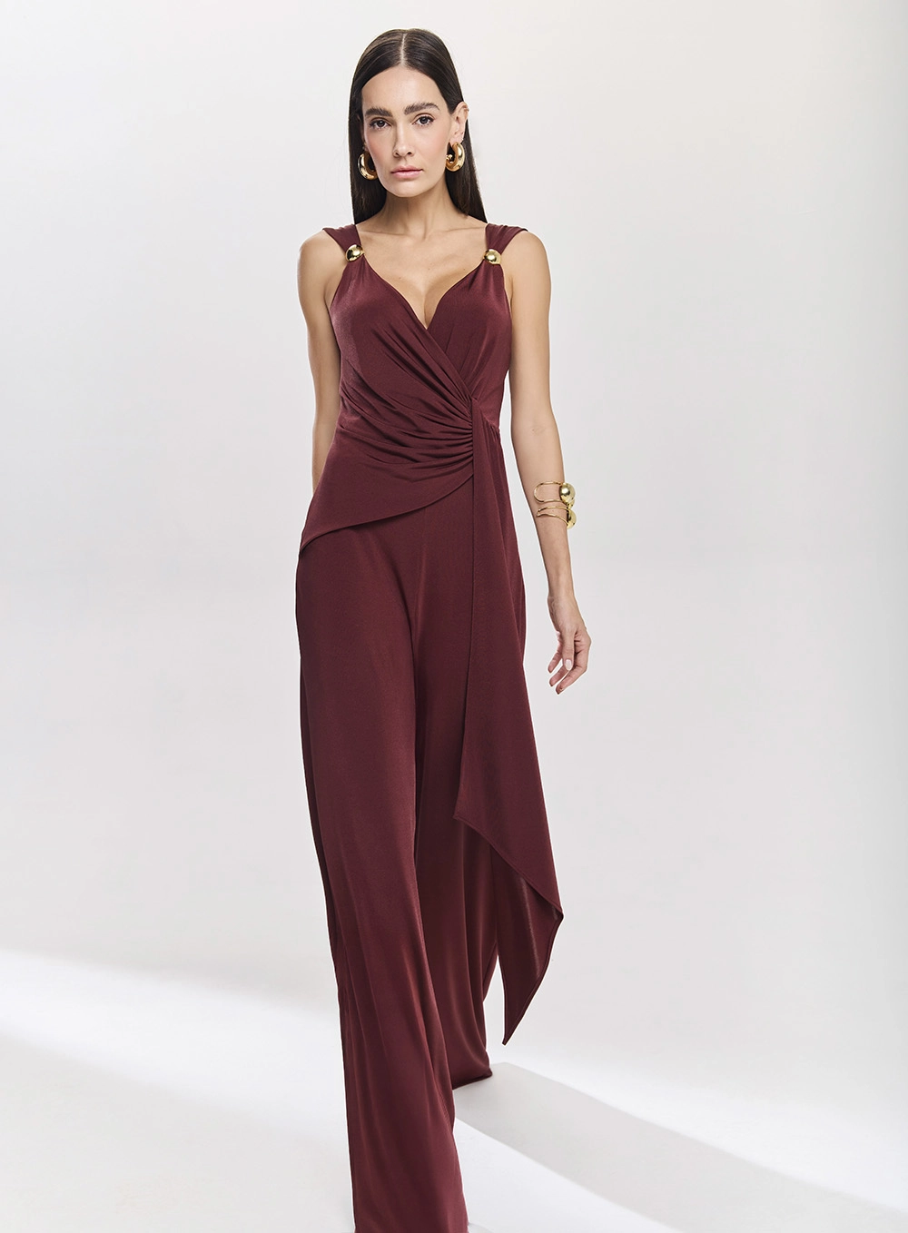 A parte superior tem decote V transpassado valorizando o colo com feminilidade, enquanto o franzido estratégico na cintura define a silhueta com sutileza. A calça pantalona ampla garante mobilidade e fluidez alongando a silhueta com imponência. O diferencial da peça fica por conta da faixa lateral fluida que adiciona movimento e personalidade ao visual. Detalhes em aviamento nas alças funcionam como pontos de sofisticação além de permitir ajuste ideal ao corpo. O fechamento posterior em zíper invisível preserva a estética minimalista e refinada da peça.