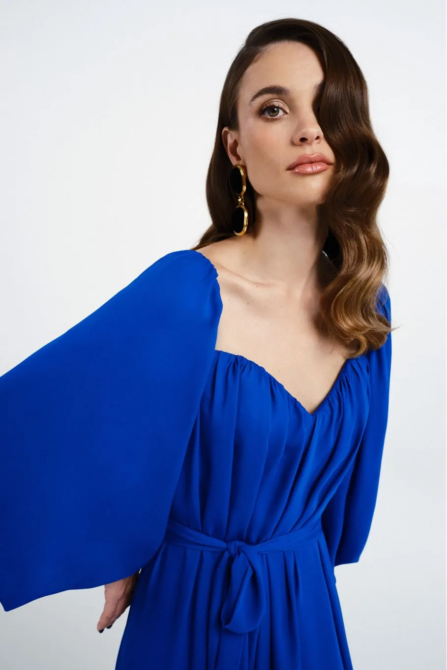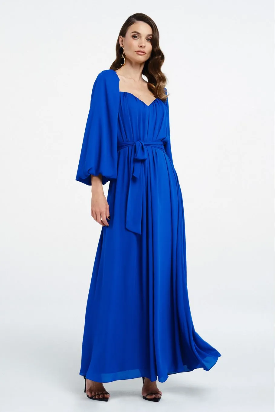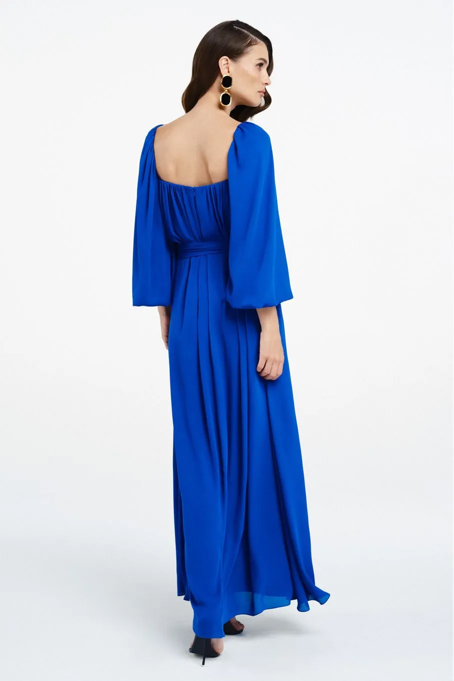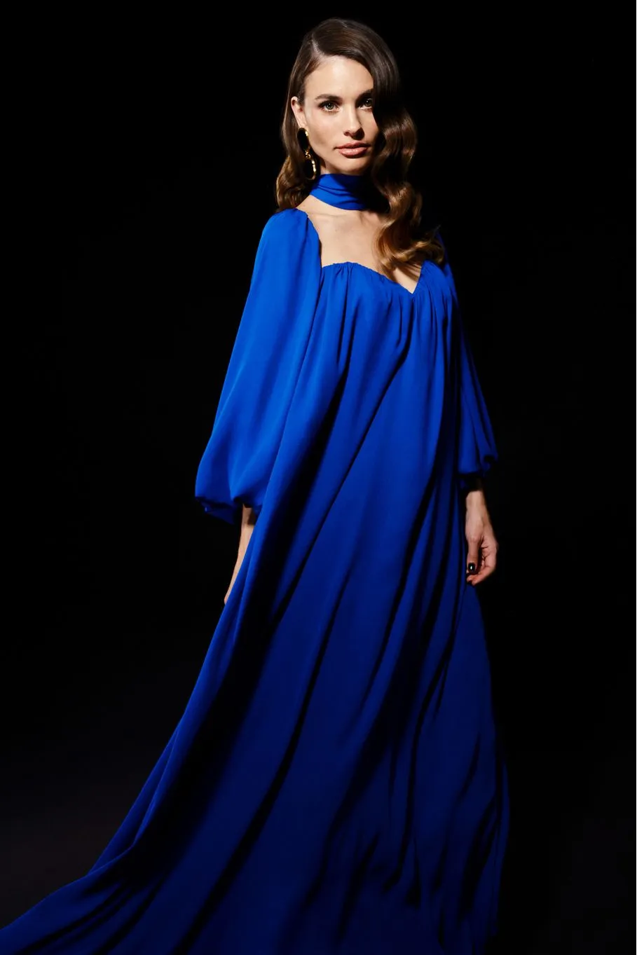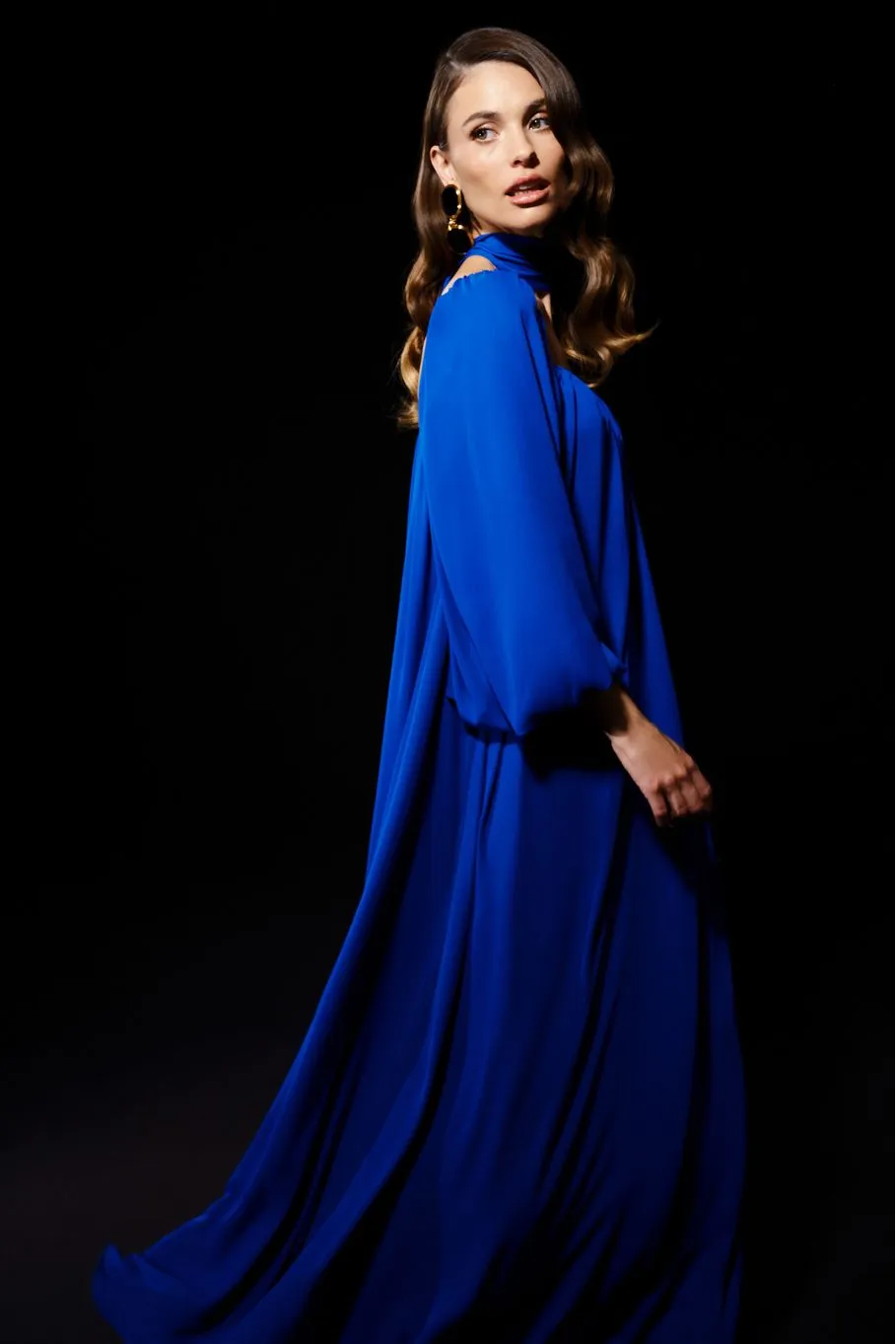 O vestido Adele é confeccionado em crepe mousse. A peça adequada para ocasiões festivas, apresenta modelagem fluída com decote princesa e mangas bufantes, proprocionando um visual elegante e moderno. Possui comprimento longo, forro, zíper invisível posterior, aro para sustentação do busto e faixa para amarração.