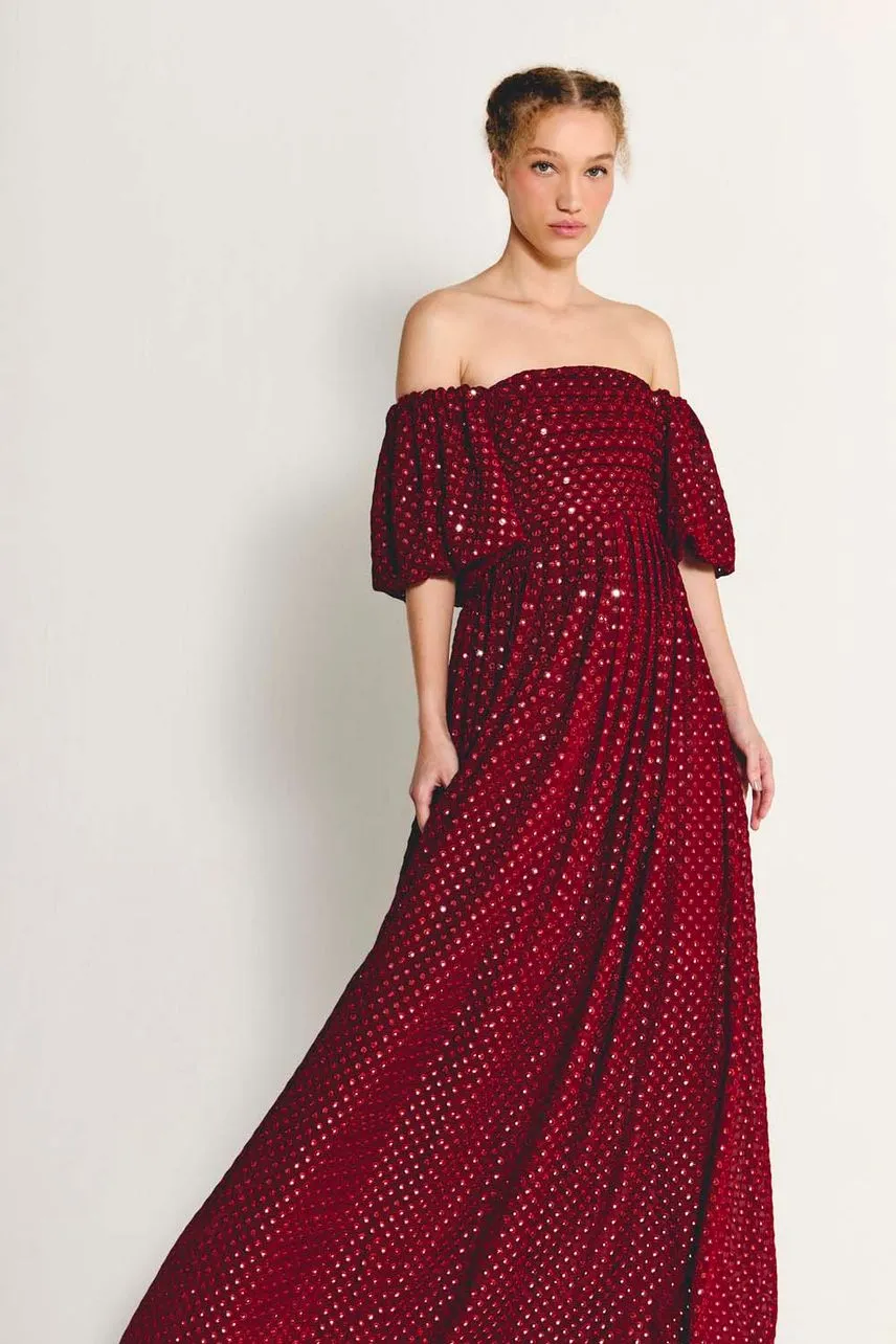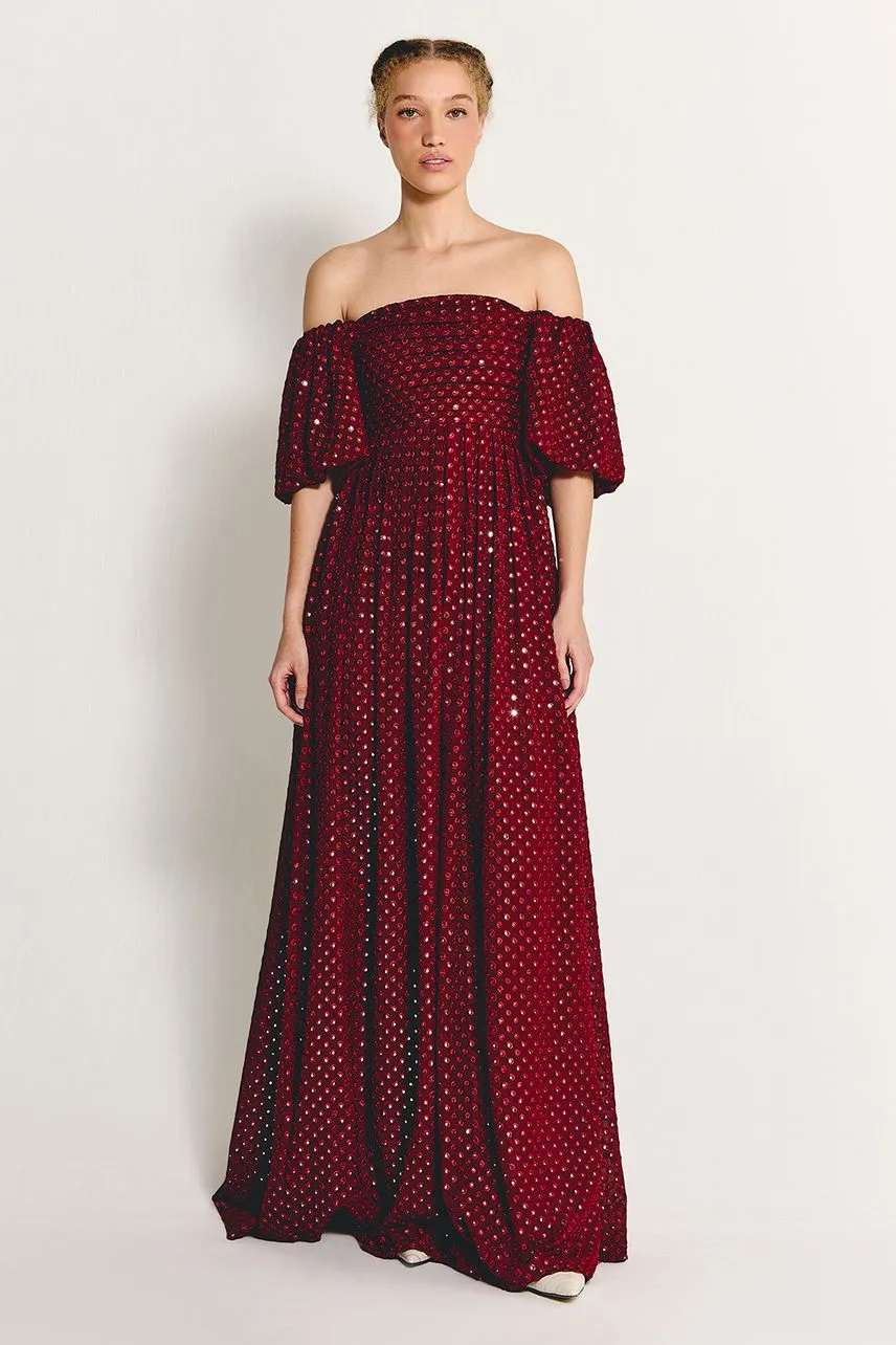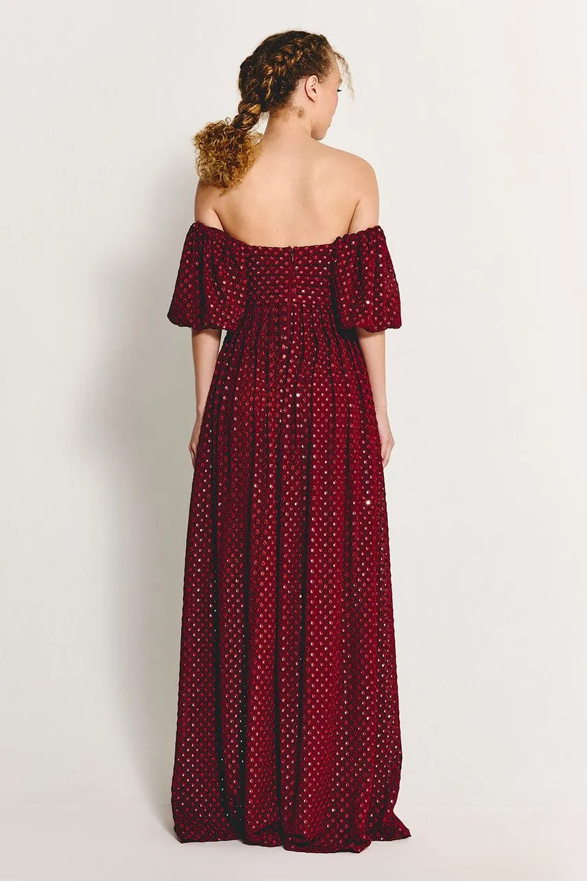 Vestido longo em tecido bordado especial com modelagem regular. Possui manga curta franzida e fechamento posterior por zíper.