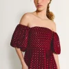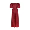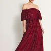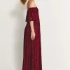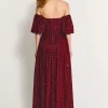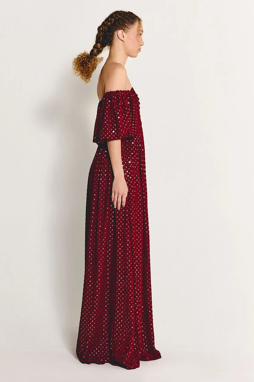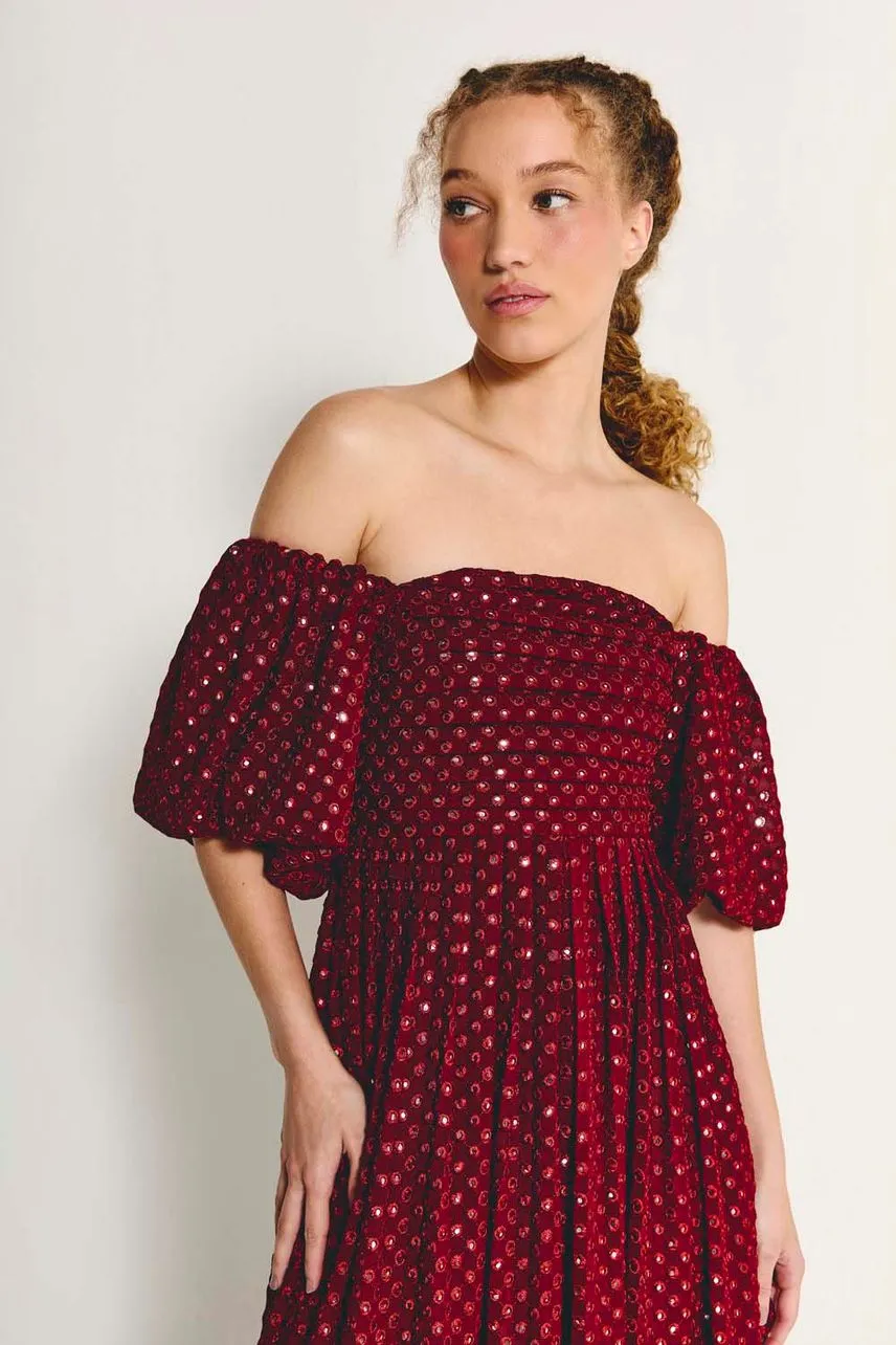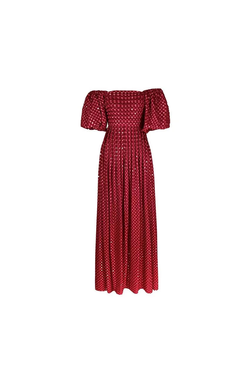 Vestido longo em tecido bordado especial com modelagem regular. Possui manga curta franzida e fechamento posterior por zíper.