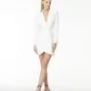 O vestido Ella é confeccionado em alfaiataria. A peça apresenta modelagem solta no estilo blazer com barra assimétrica, proporcionando um visual elegante e moderno. Possui aplicação posterior de cristais retangulares no ombro, decote em formato v, botão forrado, lapelas, mangas compridas, forro e acabamento pespontado. Peça com detalhes delicados, recomenda-se cuidado ao lavar.