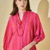 A peça possui gola dupla, fecho frontal por meio de caseados e botões, franzido na barra criando um leve babado, comprimento curto, shape solto e modelagem reta.