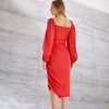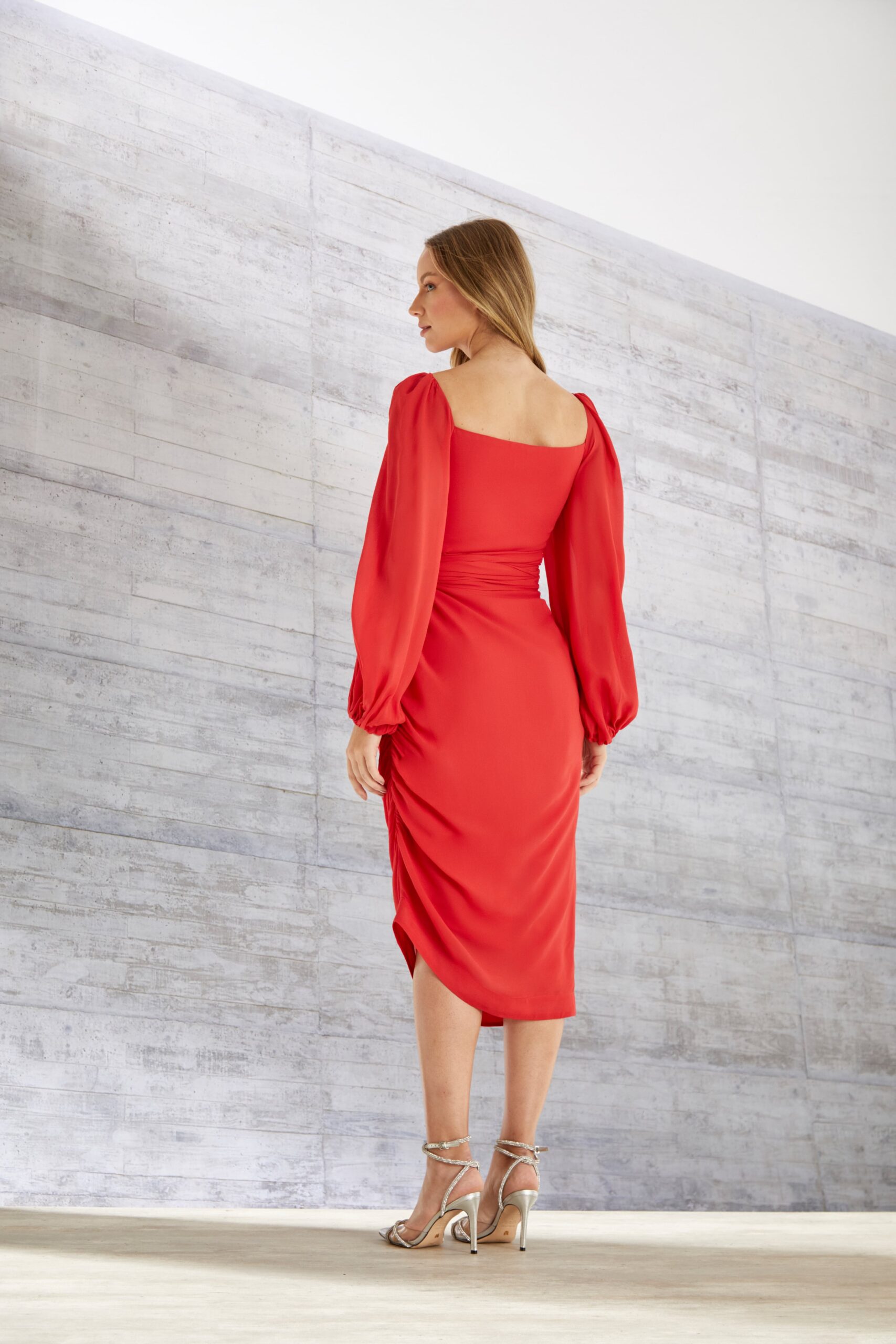 O vestido vermelho é confeccionado em georgete de viscose. A peça apresenta decote coração e mangas amplas em modelo puff, proporcionando um visual fresh e elegante. Possui decote profundo, detalhe de franzidos no busto, mangas 3/4, cinto faixa para amarração na cintura, comprimento midi, caimento reto e acabamento pespontado.