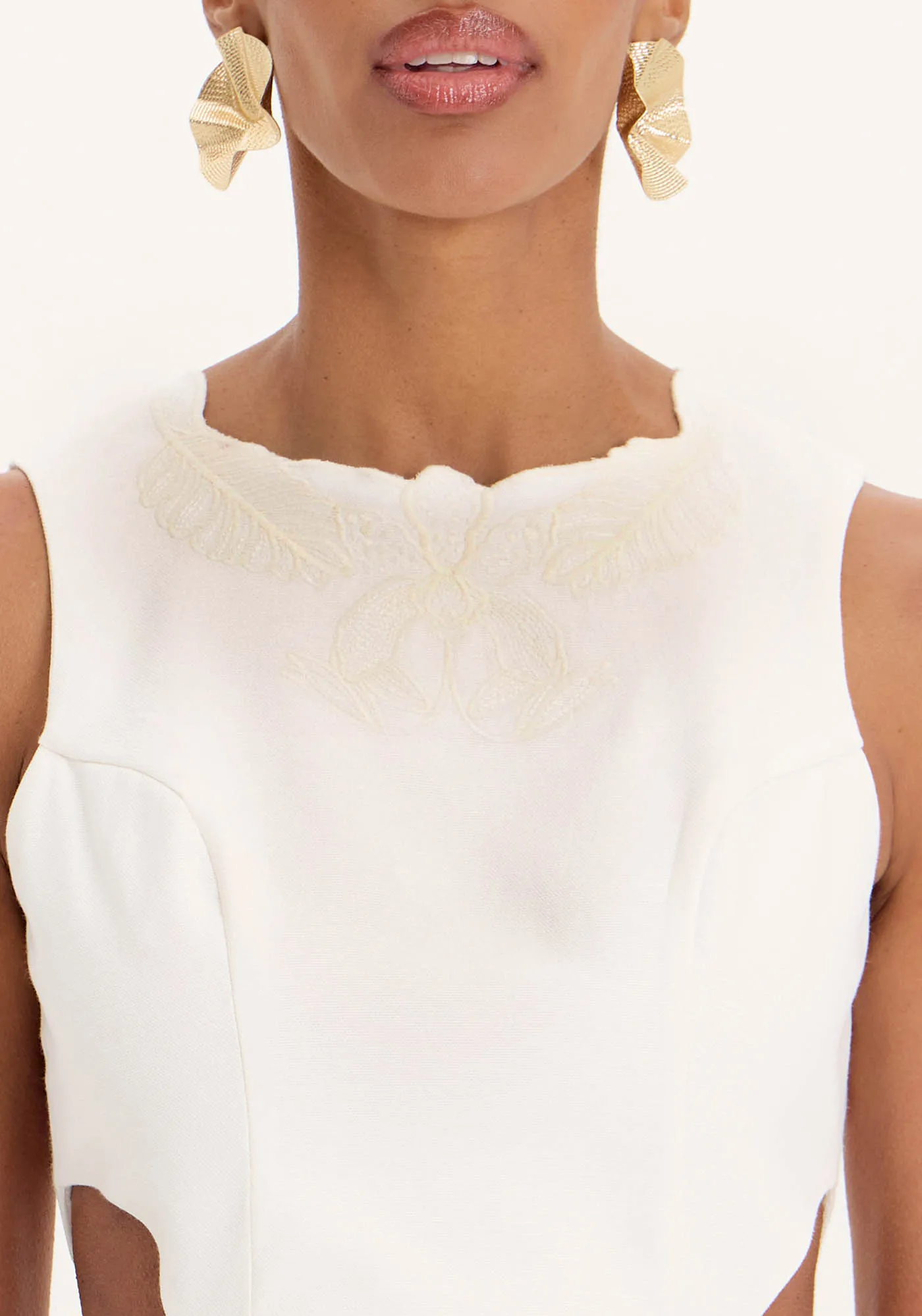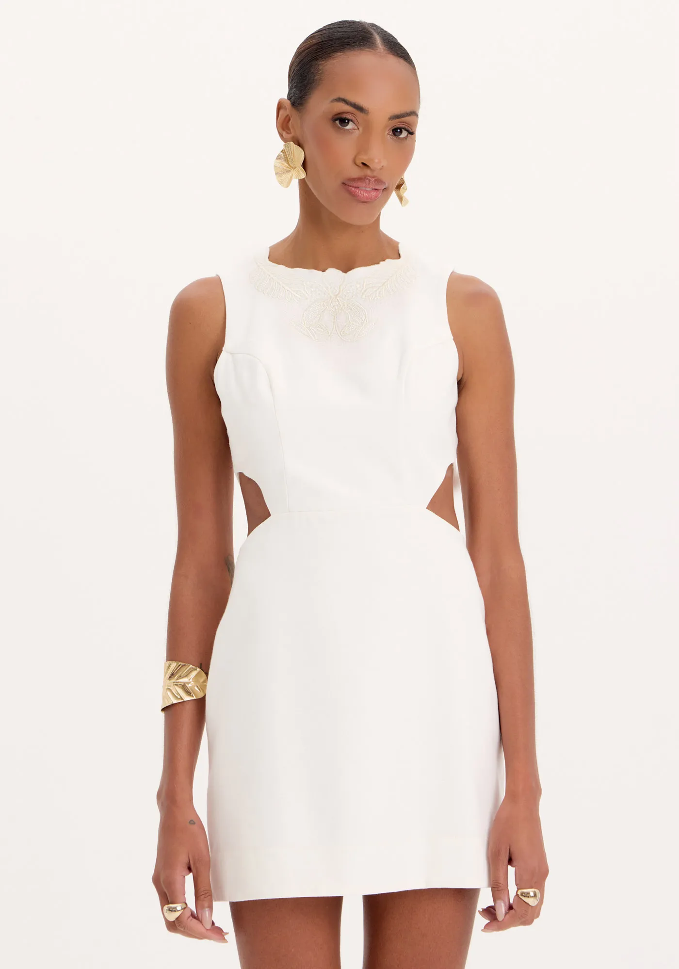 o vestido curto sem mangas é a peça perfeita para um visual sofisticado. Com detalhes de bordado delicado, recortes estratégicos e fechamento por zíper nas costas, ele combina elegância e modernidade.