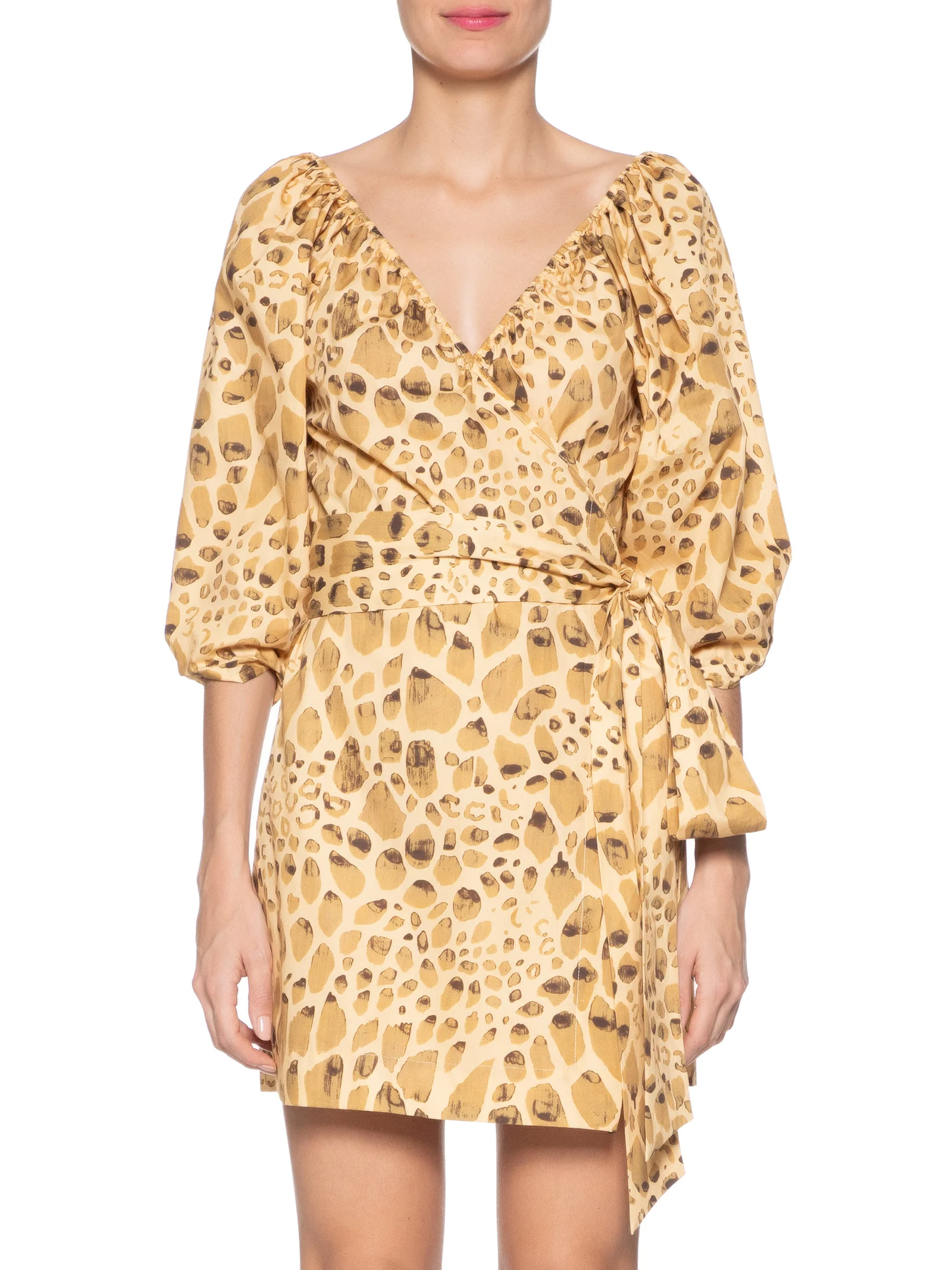 O vestido amarelo é confeccionado em tecido leve sem elasticidade. A peça solta ao corpo possui decote V transpassado, mangas 3/4 bufantes, estampa abstrata em cores contrastantes, comprimento curto e fechamento lateral por tiras alongadas aplicadas para amarração.