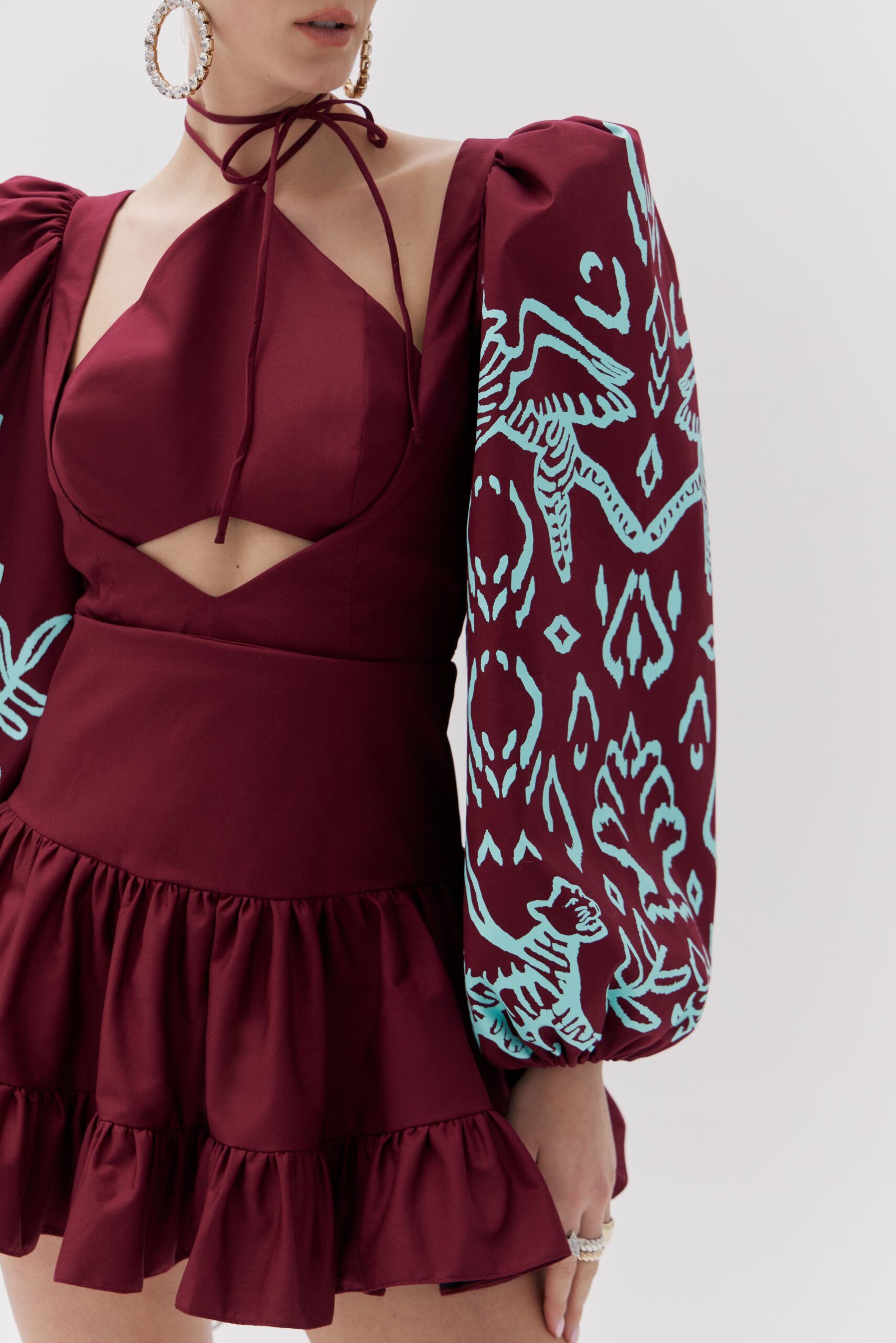 O vestido curto com franzidos apresenta estética color block, além de recortes em cut off e caimento estruturado. Os babados, amarrações e decote complementam o visual.