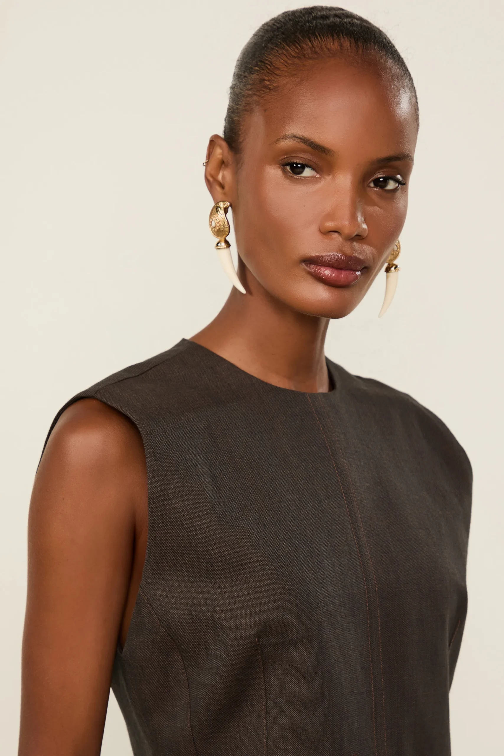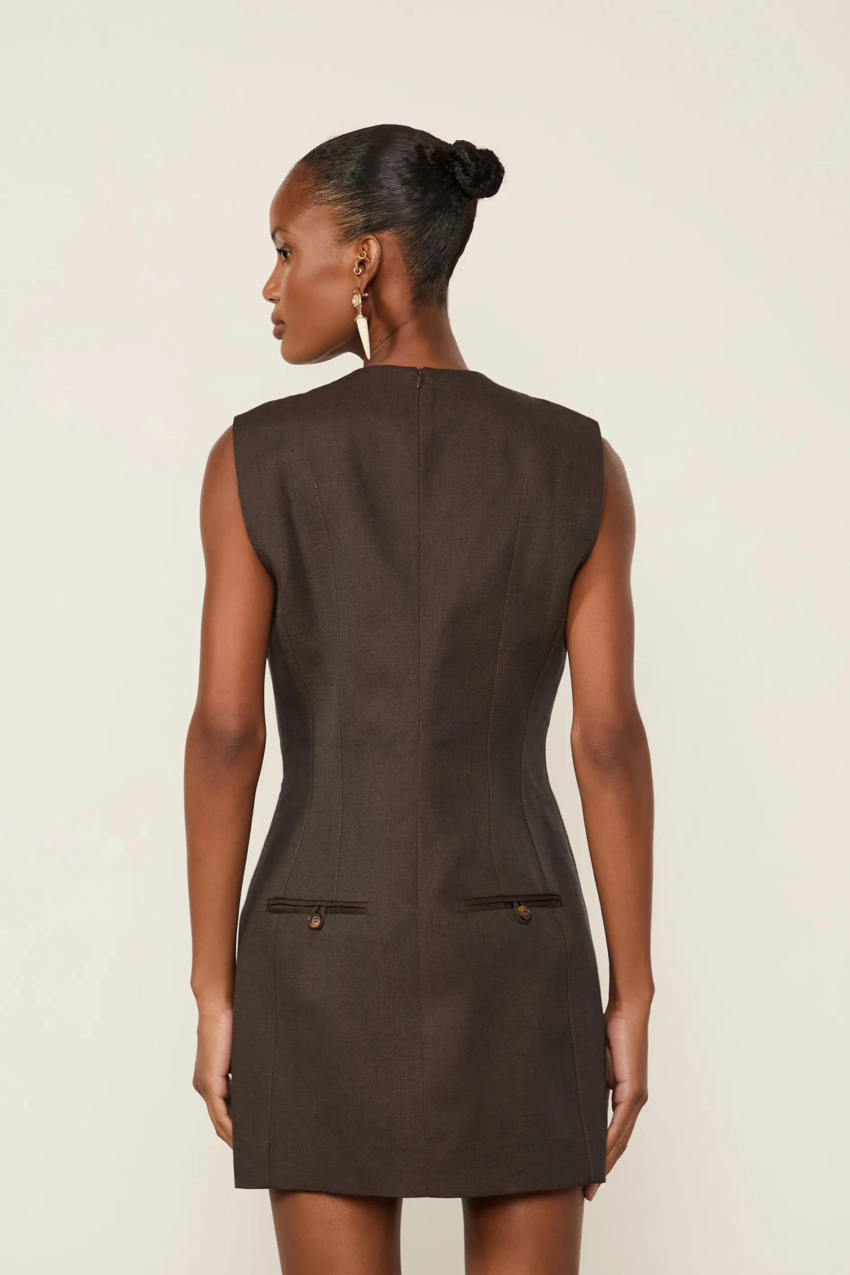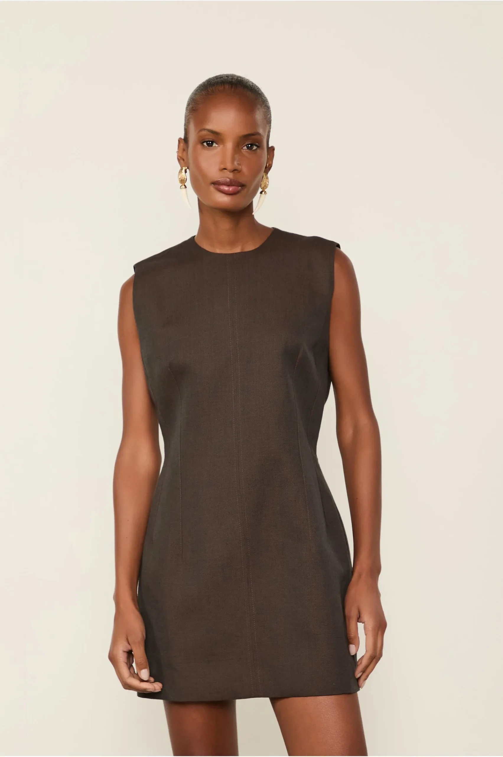 Vestido Curto Liso estruturado e sem mangas. Possui forro, decote redondo e recortes que acinturam o modelo e valorizam a silhueta. A peça também apresenta bolso faca com abotoamento e fechamento por zíper nas costas. Uma escolha que traduz sofisticação atemporal.