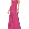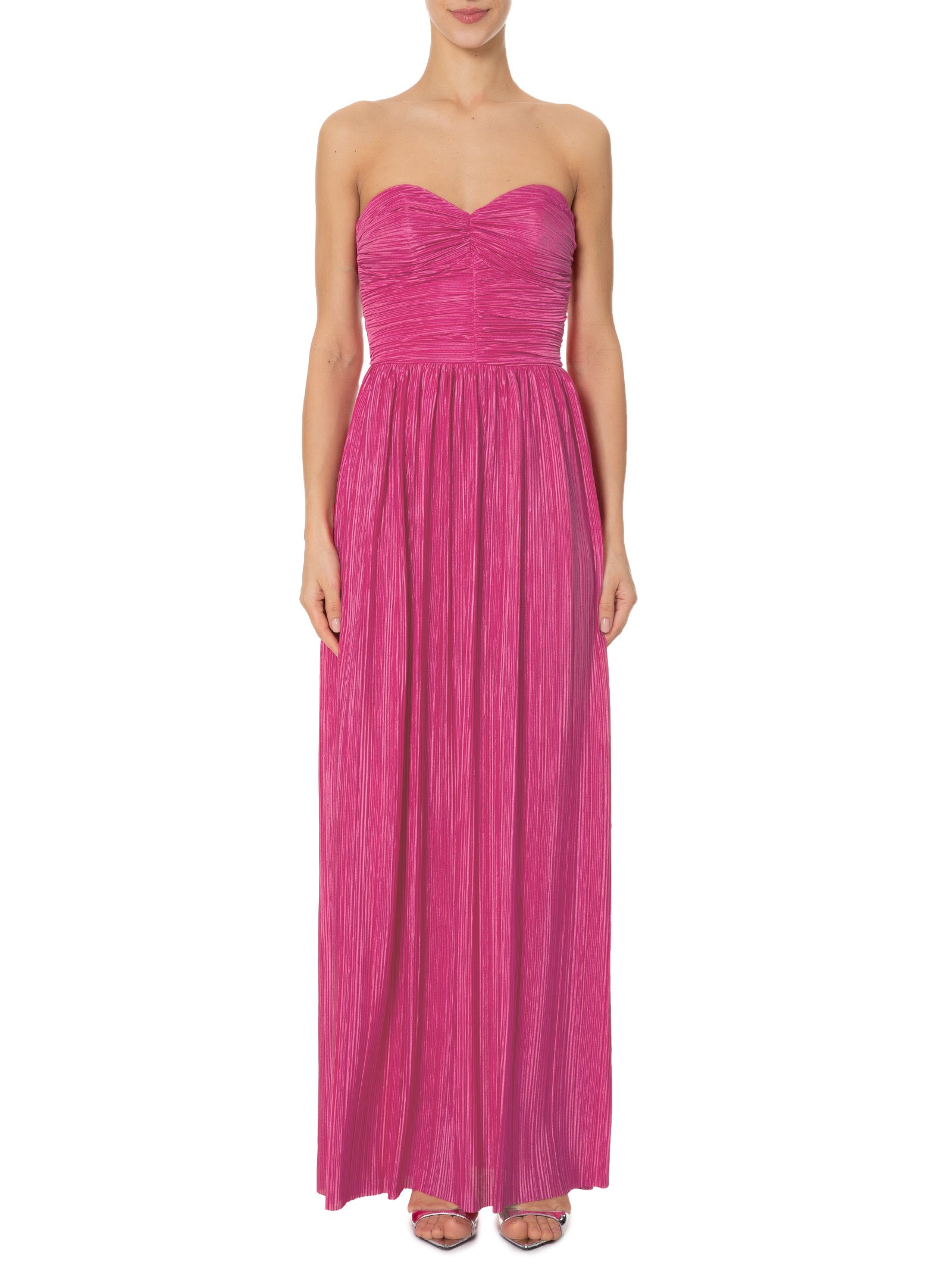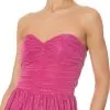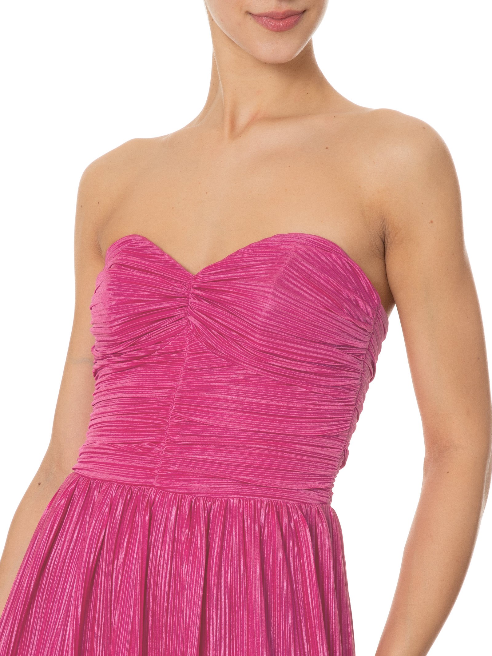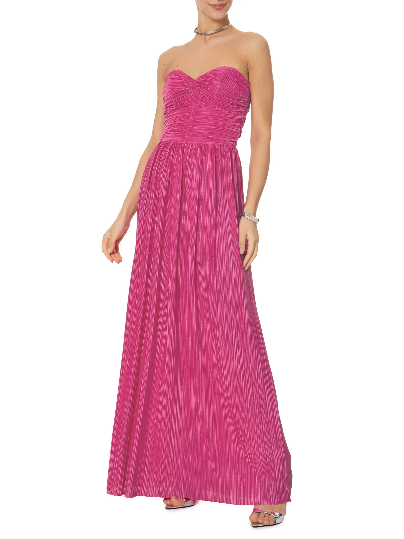 O vestido rosa é confeccionado em tecido leve com superfície acetinada e sem elasticidade. A peça justa ao busto e solta no comprimento de modelo tomara que caia possui decote coração, recortes frontais, detalhe franzido na parte frontal e laterais com barbatanas embutidas, efeito plissado, leve transparência, forro, comprimento longo e fechamento posterior por zíper invisível.