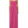 O vestido rosa é confeccionado em tecido leve com superfície acetinada e sem elasticidade. A peça justa ao busto e solta no comprimento de modelo tomara que caia possui decote coração, recortes frontais, detalhe franzido na parte frontal e laterais com barbatanas embutidas, efeito plissado, leve transparência, forro, comprimento longo e fechamento posterior por zíper invisível.