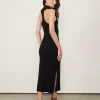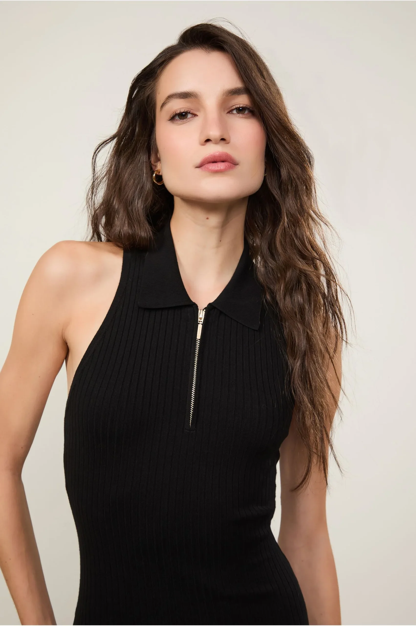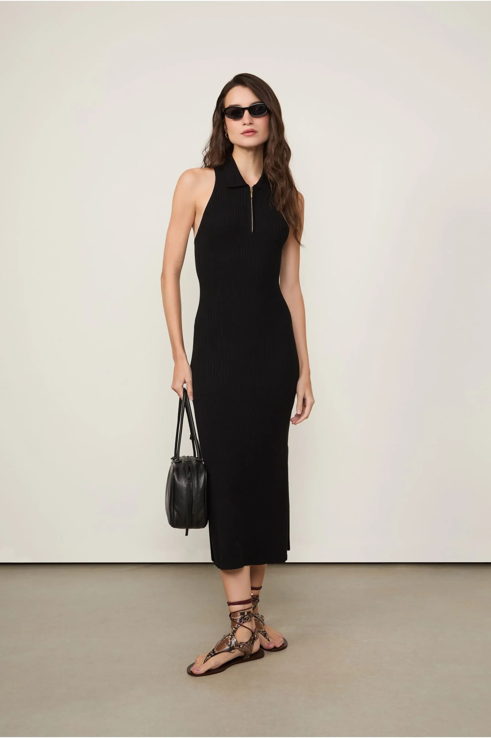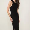 Vestido midi em tricot com modelagem ajustada e caimento leve. Possui decote polo com zíper, sem mangas, costas abertas e fenda lateral.