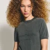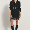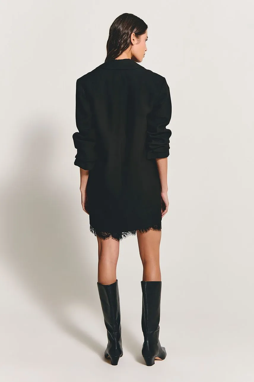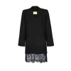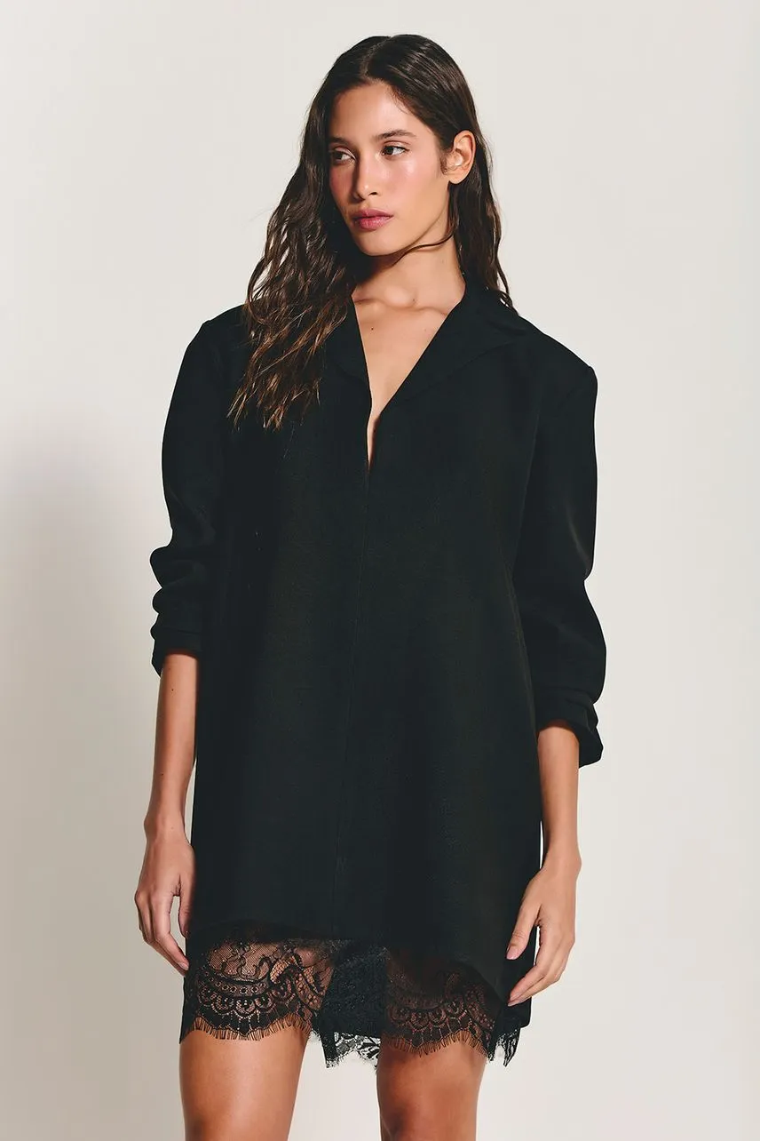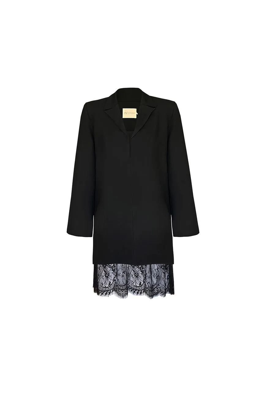 Vestido midi em crepe de acetato. Possui fechamento por botão e acabamento rendado na barra.