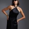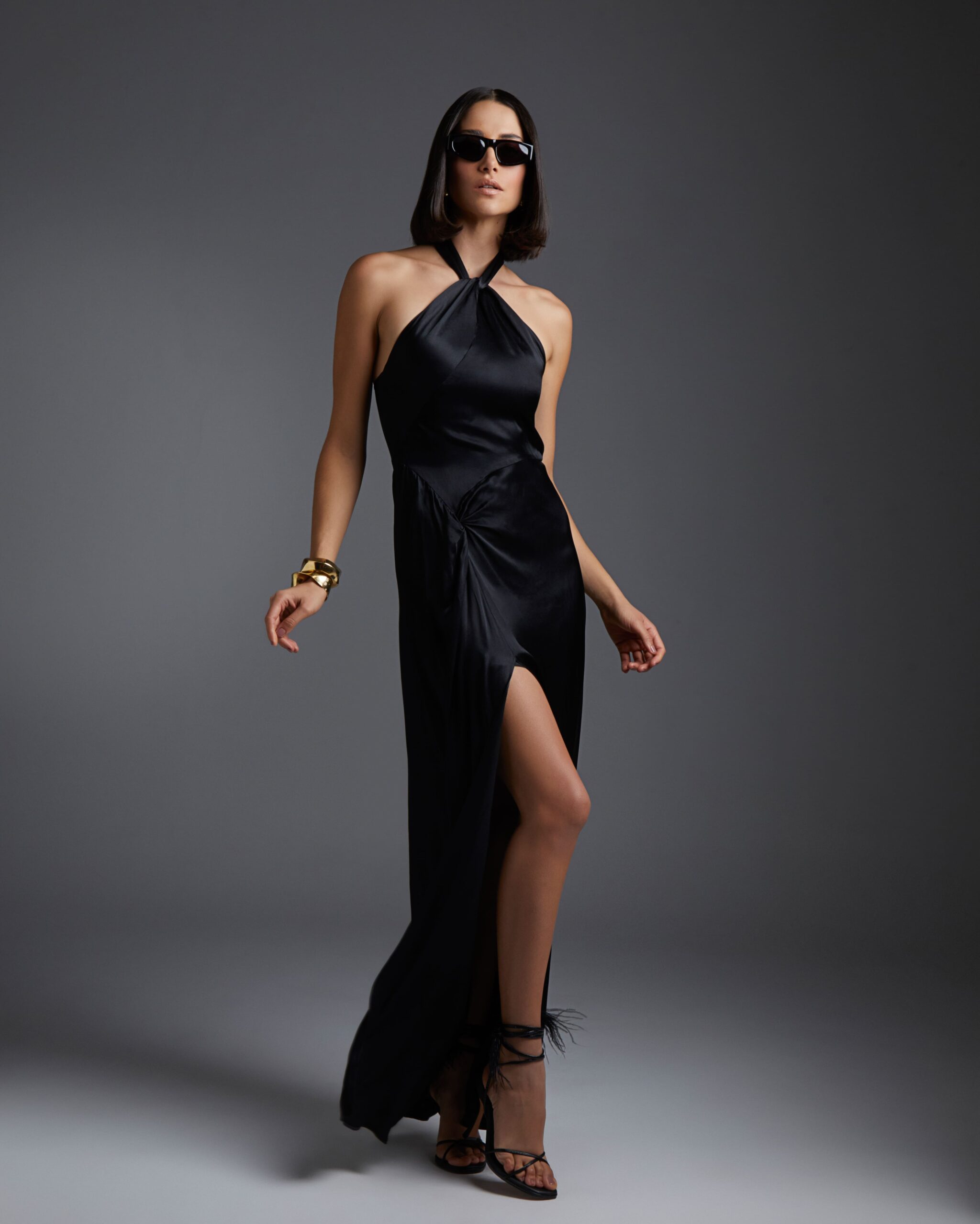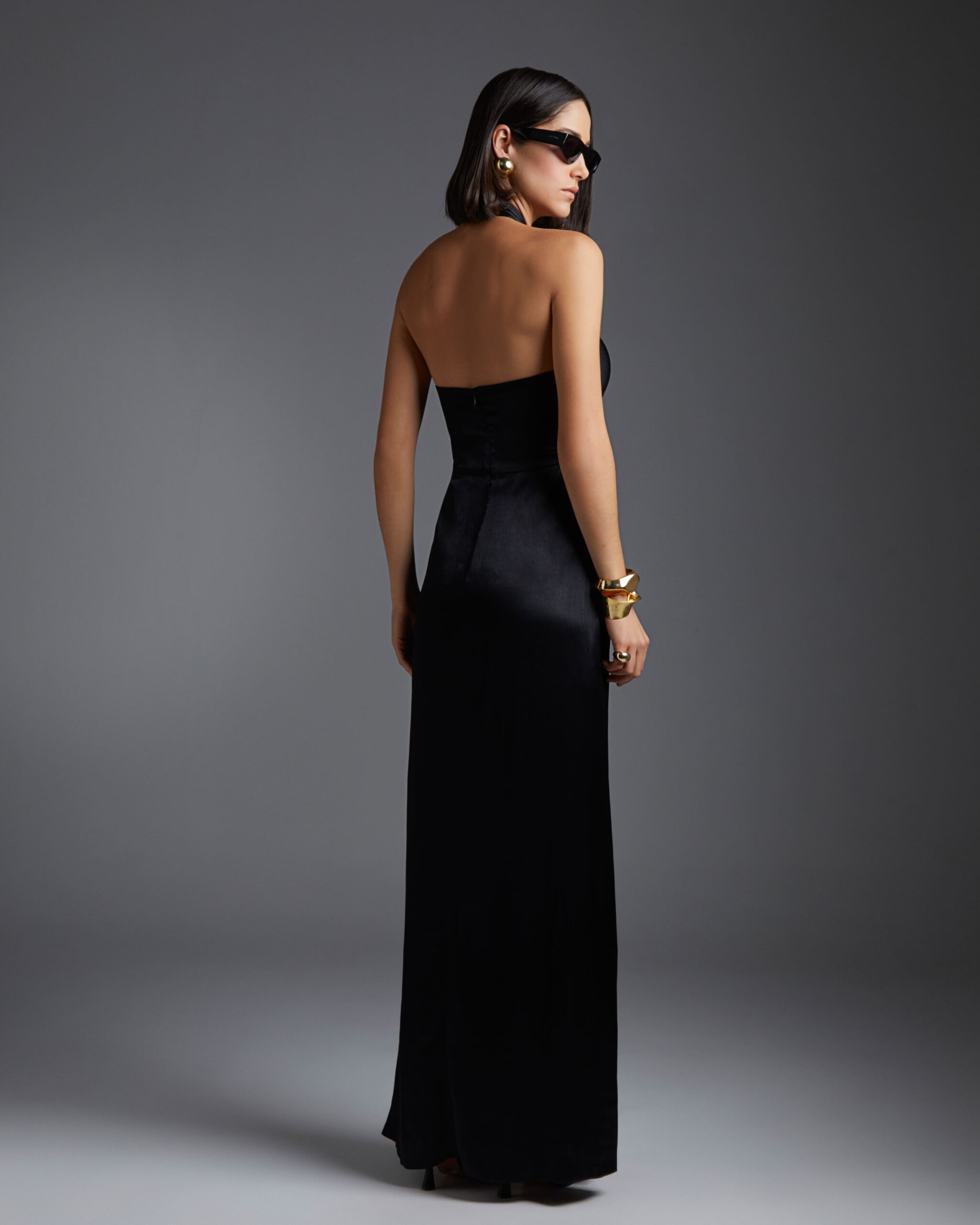 O vestido Esther é confeccionado em cetim, tecido com acabamento liso, brilhoso e acetinado. A peça apresenta modelagem solta com fenda e detalhe de nó anterior, proporcionando um visual glamouroso e sensual. Possui cava americana com recorte e nó rente ao pescoço, comprimento longo com forro curto, zíper invisível posterior e acabamento pespontado