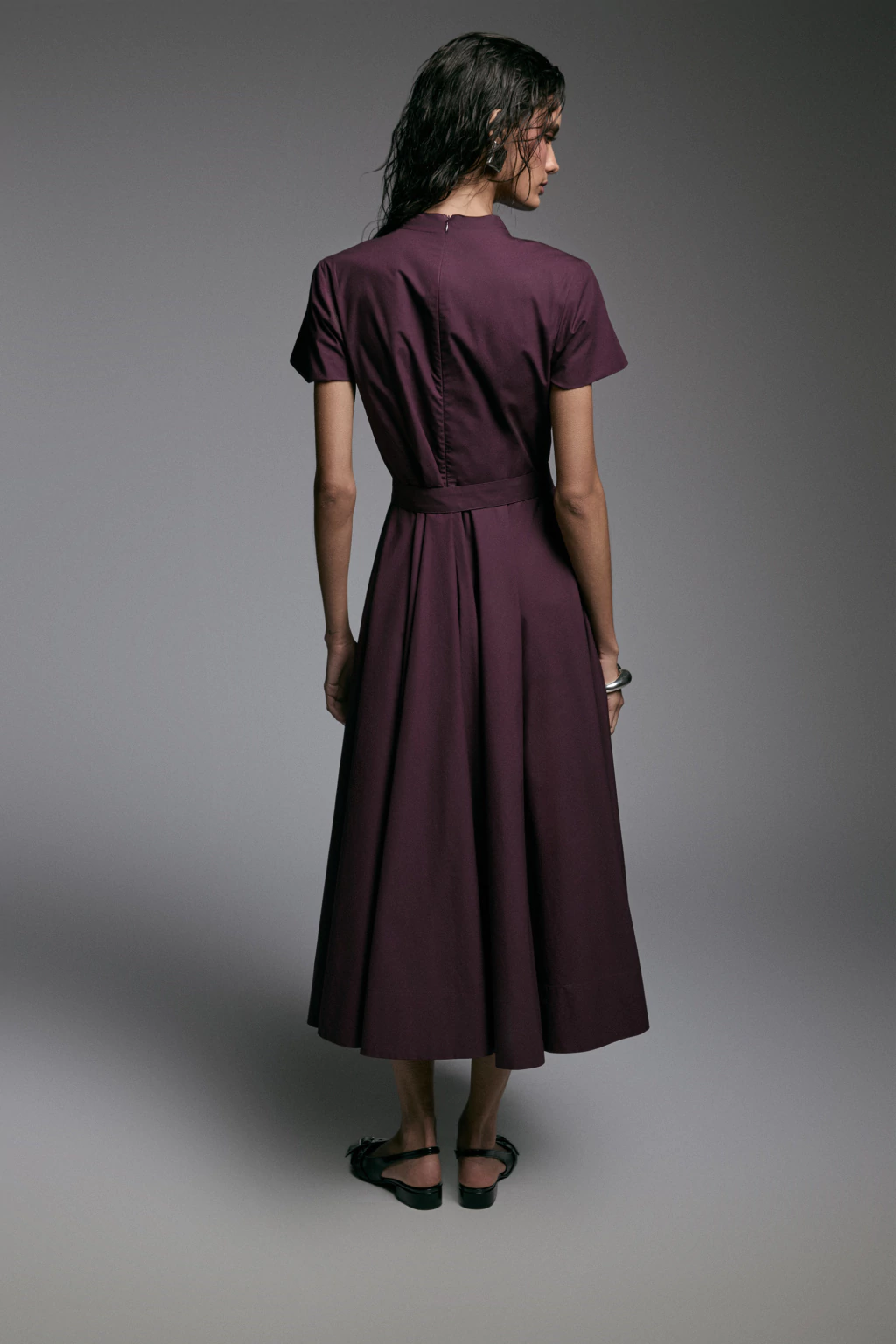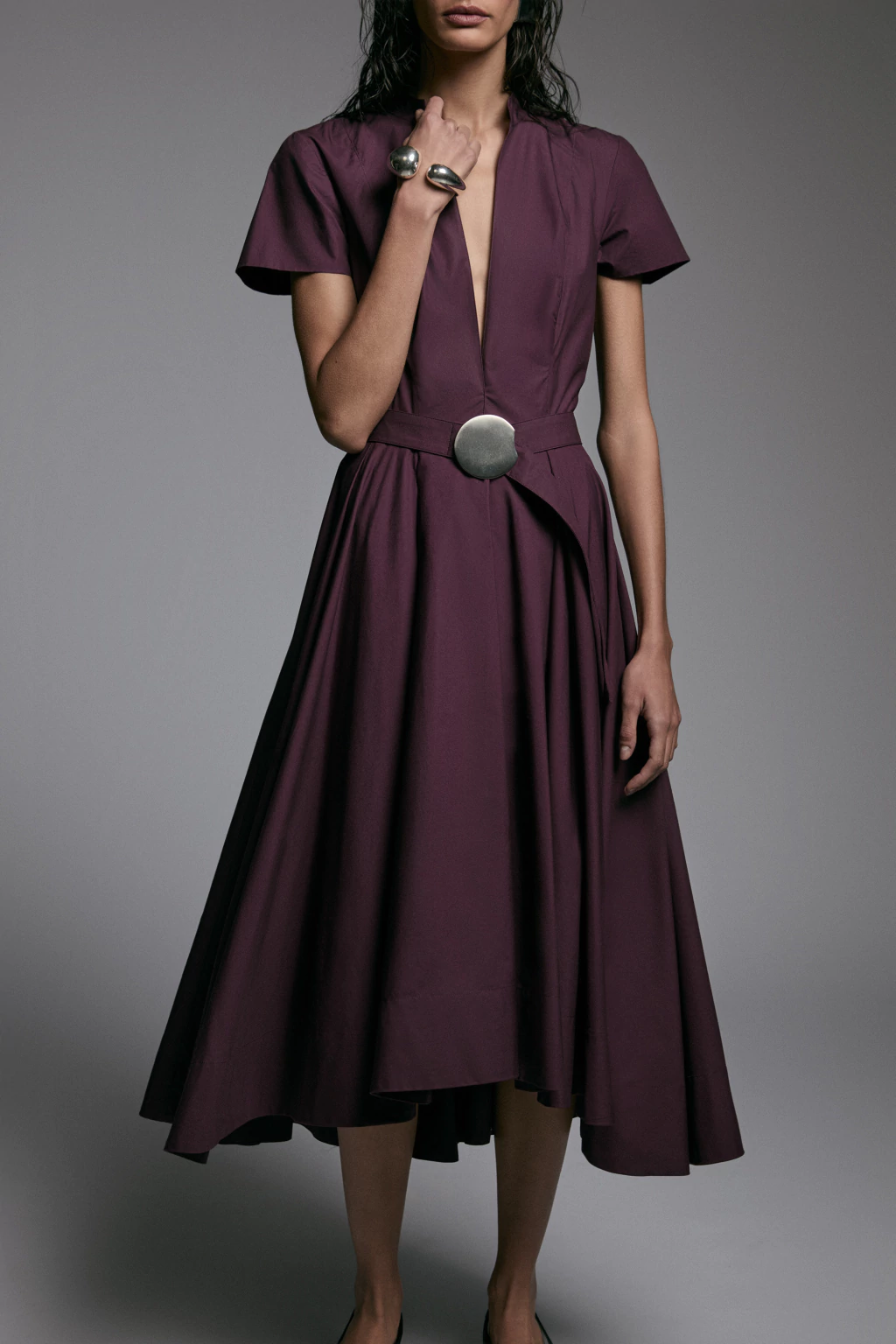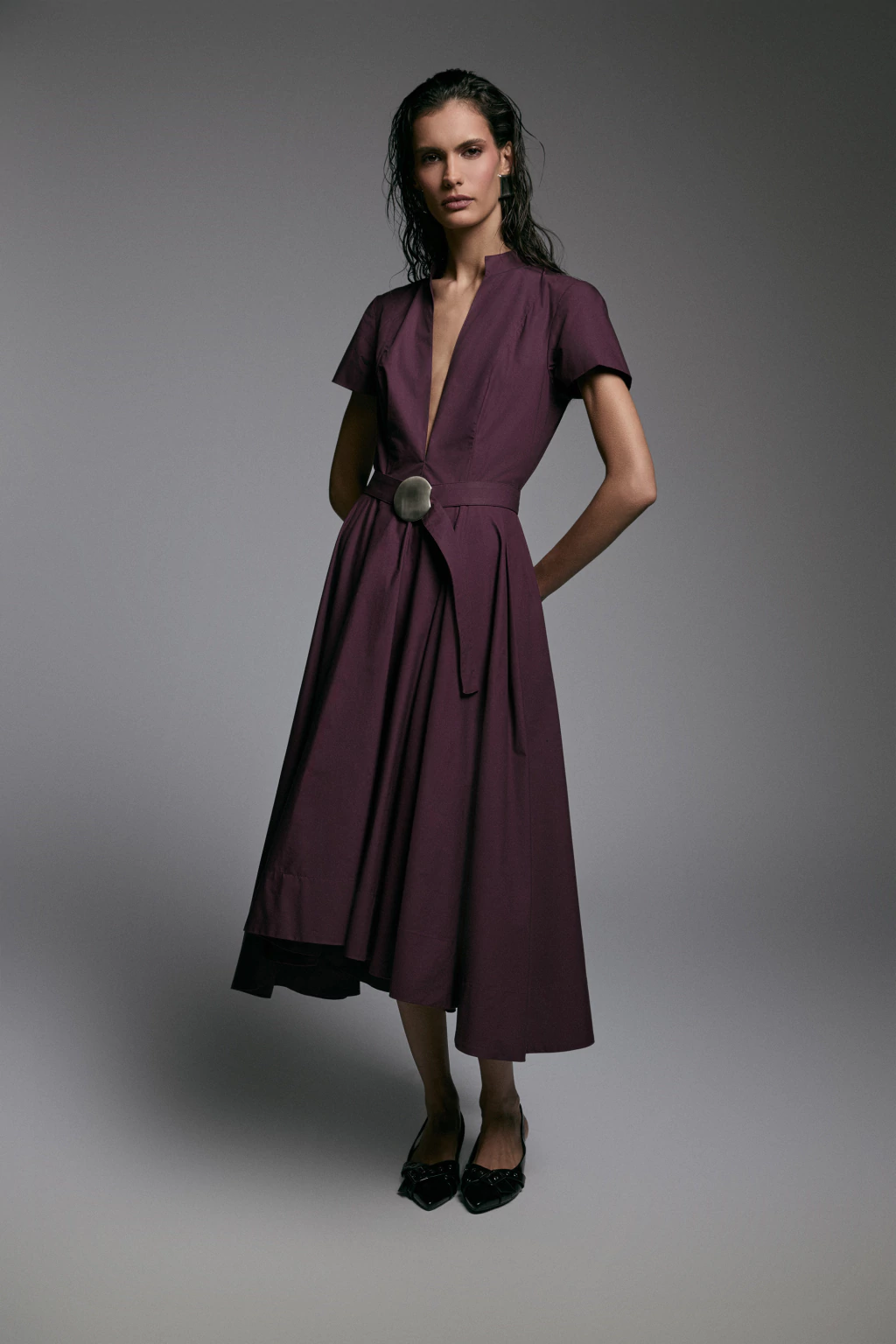 Vestido feminino confeccionado em algodão, com caimento leve que proporciona conforto e respirabilidade ao longo do uso. O decote em V valoriza o colo com elegância, enquanto a saia com pregas cria movimento e fluidez ao caminhar. Acompanha cinto faixa com fivela de formato orgânico, que marca a cintura com sutileza e acrescenta um acabamento sofisticado ao visual.