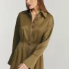 Vestido manga longa em crepe de acetato com modelagem regular acinturado por pregas. Fechamento frontal por botões.