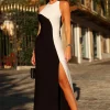 O vestido Iva é confeccionado em alfaiataria. A peça P&B apresenta modelagem solta com uma fenda anterior, proporcionando um visual sensual e elegante. Possui comprimento longo, decote redondo com cavas desportivas, zíper invisível posterior e acabamento pespontado.