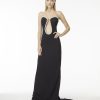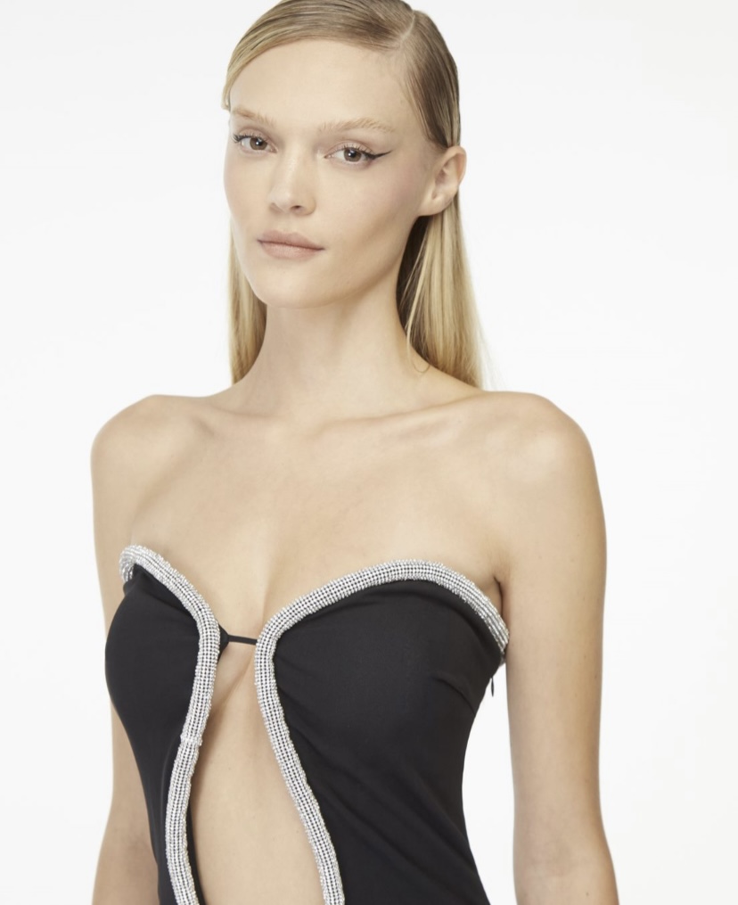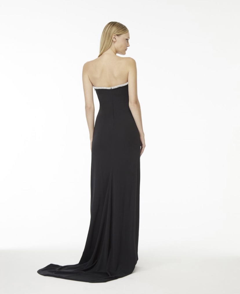 O vestido Longo é confeccionado em malha jersey. A peça apresenta modelagem solta, recorte profundo ao meio anterior com detalhe revestido em strass cristal no contorno do decote, proporcionando um visual sexy e glamouroso. Possui decote strapless no modelo coração, comprimento longo, forro solto, zíper invisível com colchete lateral e acabamento pespontado. Peça com detalhes delicados, recomenda-se cuidado ao lavar.