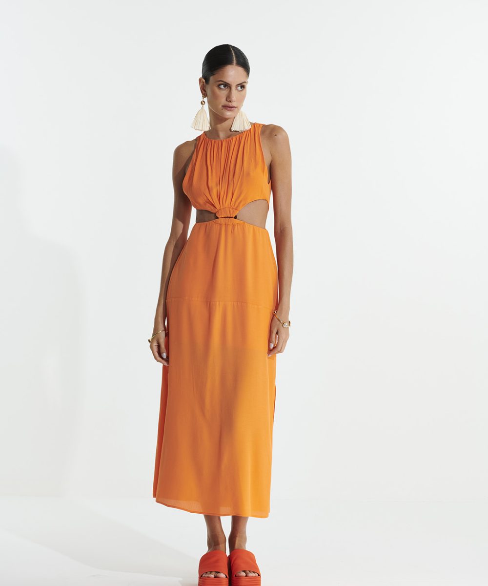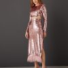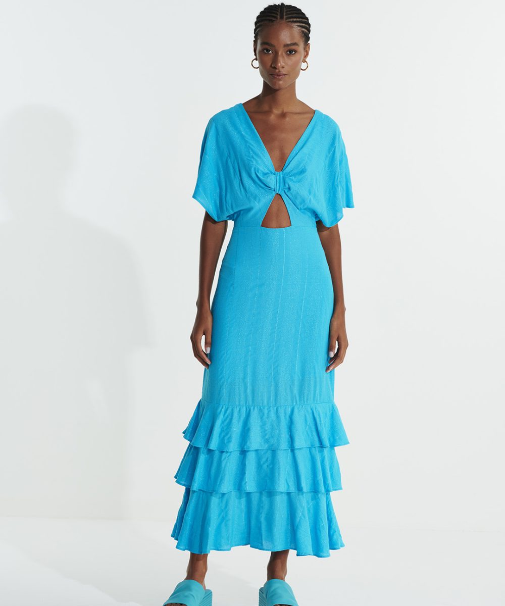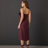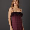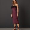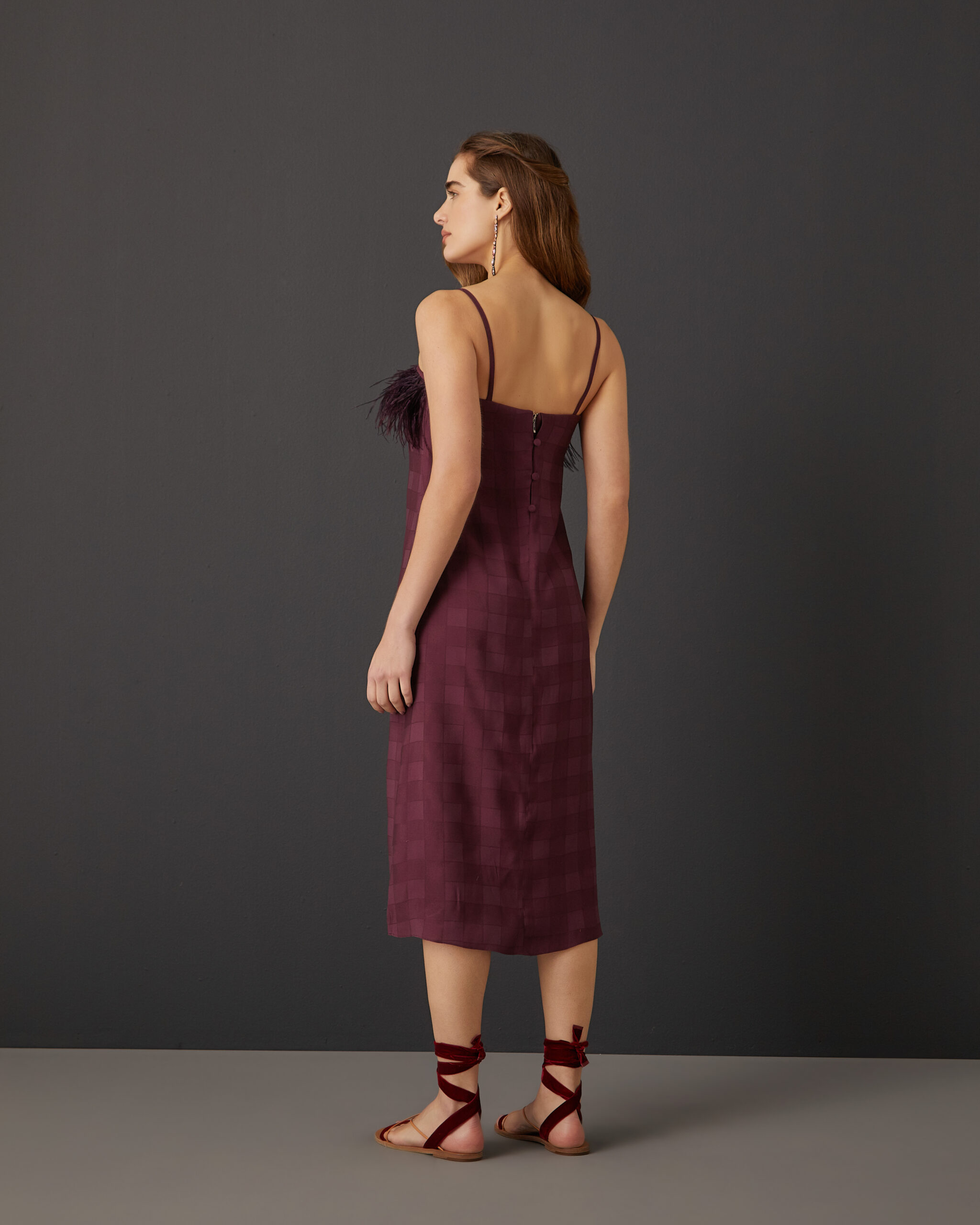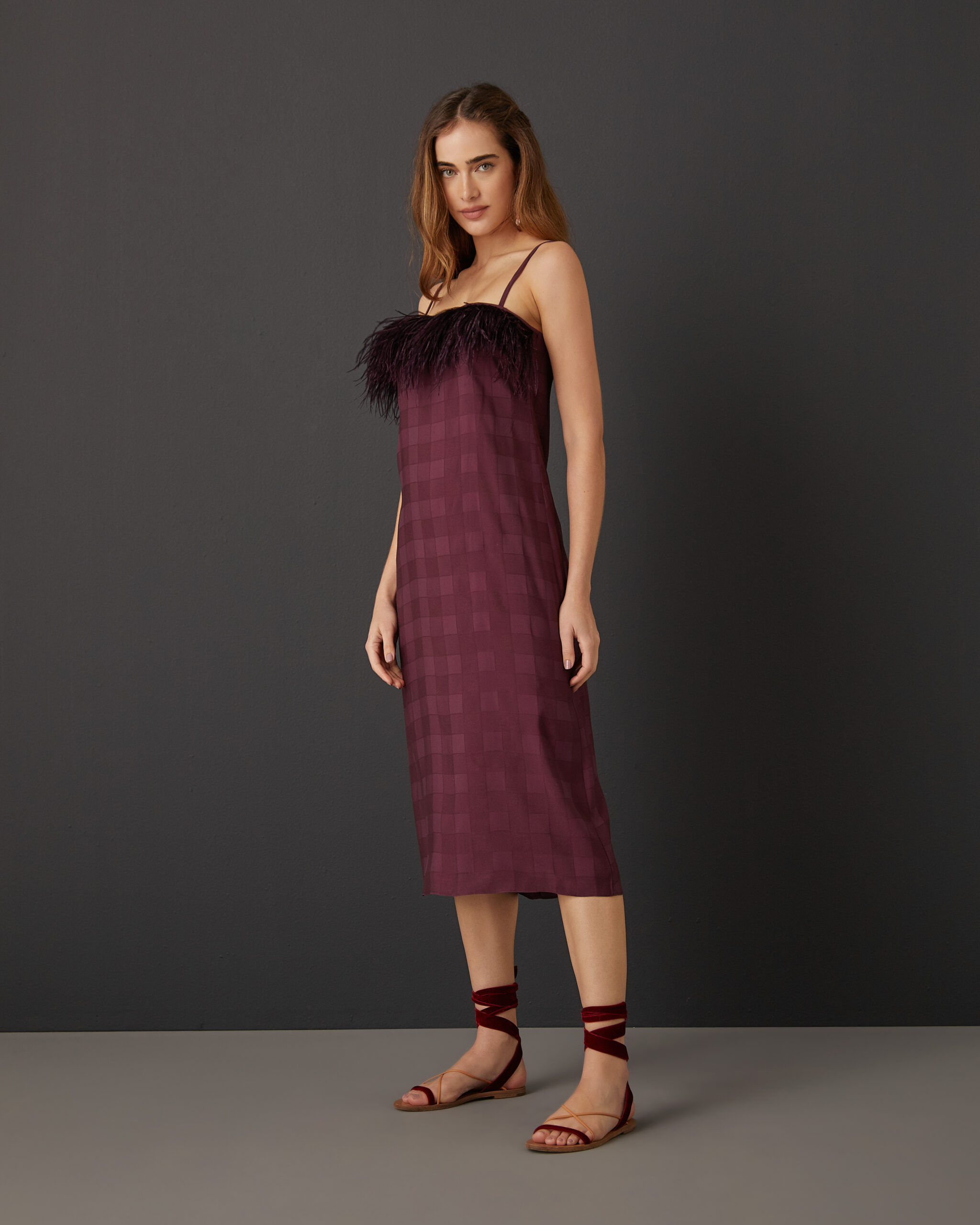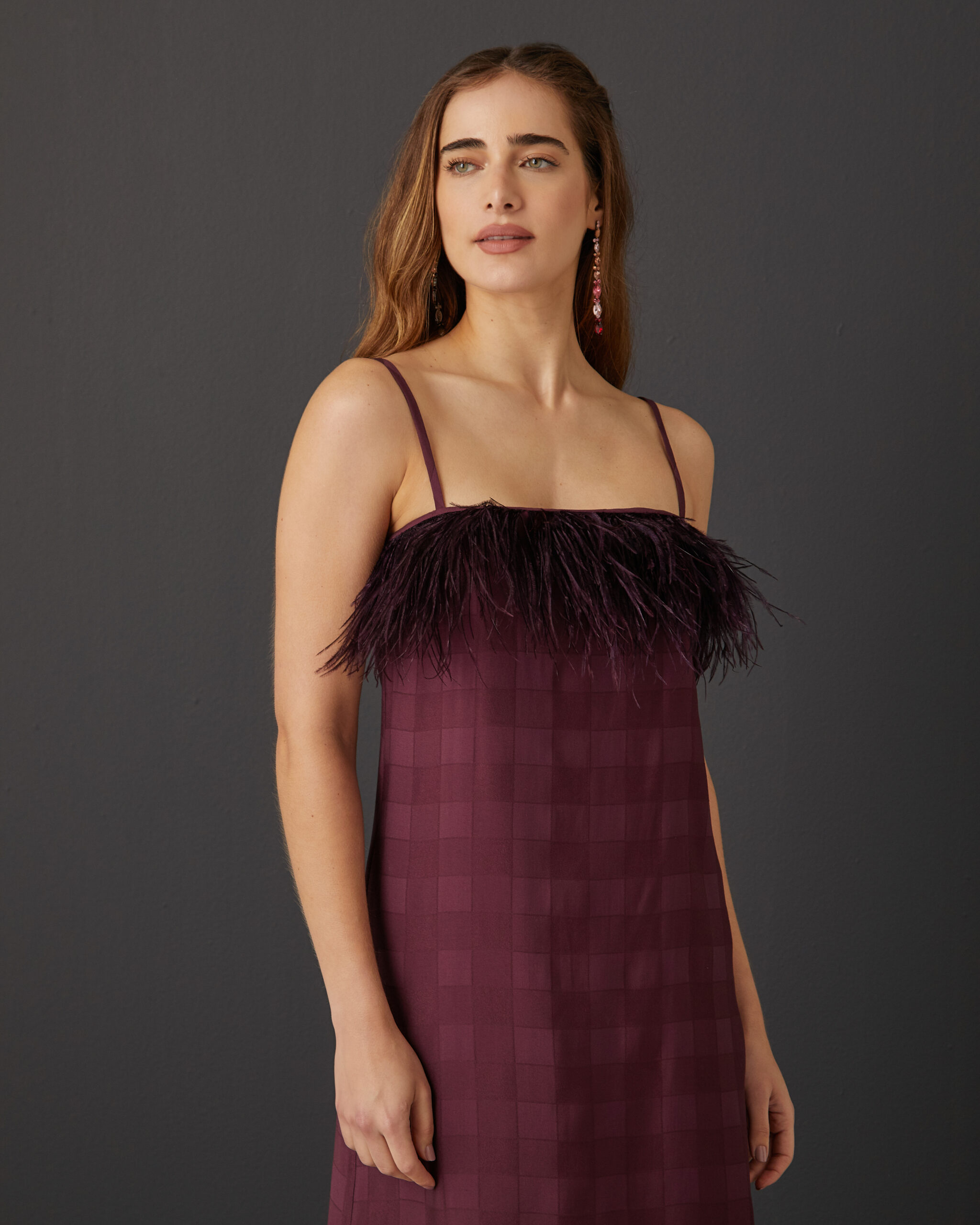 O vestido no tom roxo berinjela é confeccionado em jacquard de viscose. A peça apresenta proposta slip dress com aplicação de plumas no decote e alças finas, proporcionando um visual romântico e elegante. Possui decote quadrado, caimento reto, textura quadriculada, comprimento midi e acabamento pespontado. Fecho posterior por botões de mesma cor da peça.
