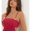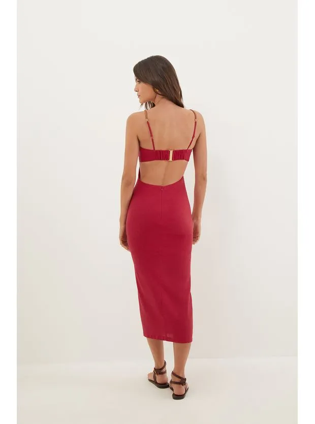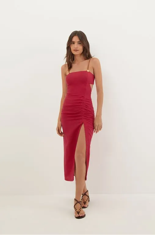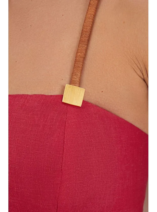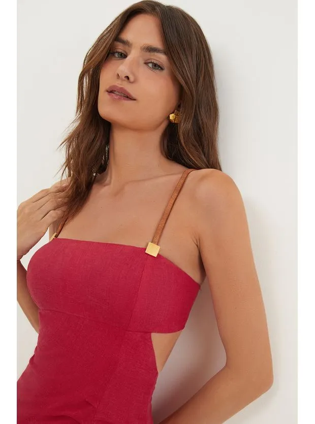 Uma peça que valoriza a silhueta, o vestido midi vermelho Mira tem a modelagem versátil para te acompanhar em diferentes ocasiões. Experimente usá-lo com sandálias, bolsas e outros acessórios ViX. – Decote reto na frente e nas costas – Alças de linha encerada caramelo e detalhe em metal dourado – Saia com franzido fixo na lateral – Fenda profunda – Costas vazadas – Fechamento com zíper e metal – Saia com modelagem reta – Possui forro Detalhes feitos à mão no ateliê ViX