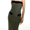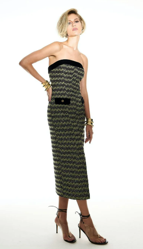 O vestido Milena é confeccionado em tweed. A peça apresenta modelagem justa e reta, com detalhes em veludo, proporcionando um visual moderno e elegante. Possui comprimento midi, decote tomara que caia reto, fenda anterior, fios em lurex e zíper posterior.