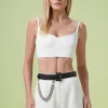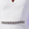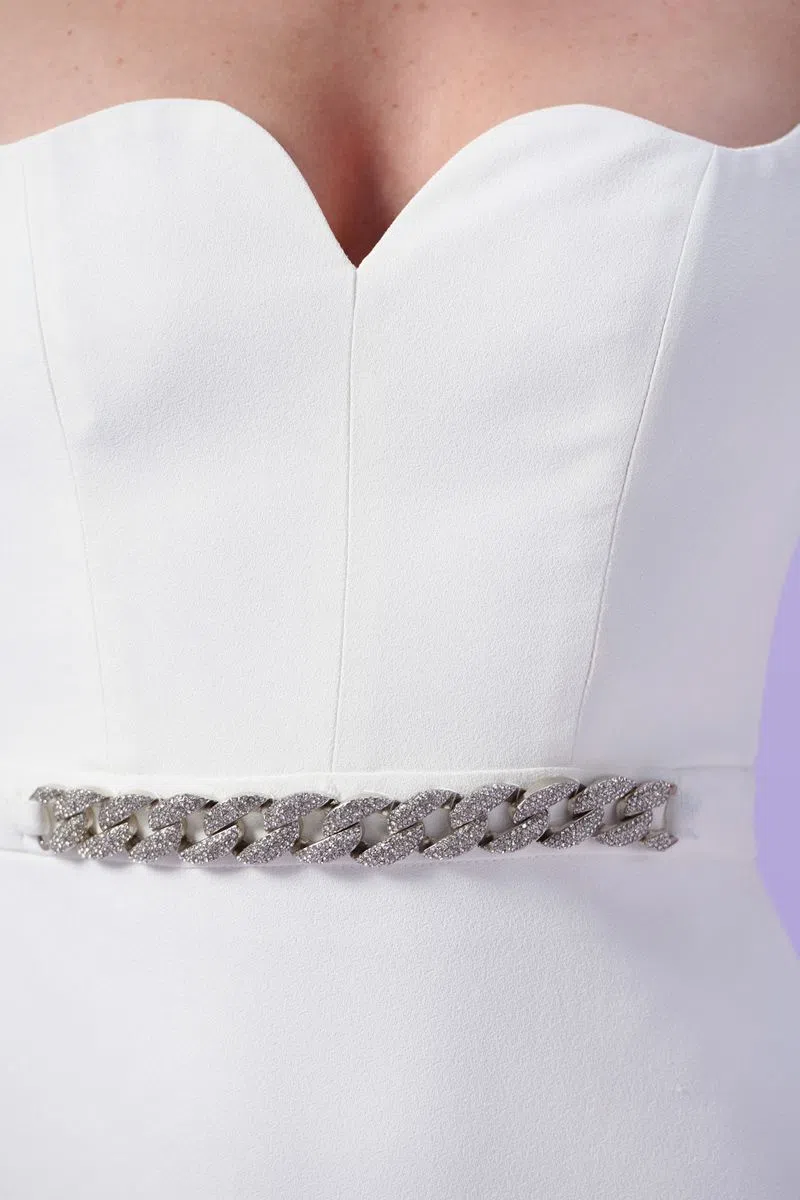 O vestido Mini Mary é uma alfaiataria confeccionado no tecido GOA. A peça apresenta modelagem justa com detalhe de corrente prata revestida em strass cristal na cintura, proporcionando um visual sensual e moderno. Possui comprimento curto, decote coração, forro embutido, alças de largura média, zíper invisível posterior e acabamento pespontado. Peça com detalhes delicados, recomenda-se cuidado ao lavar.