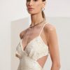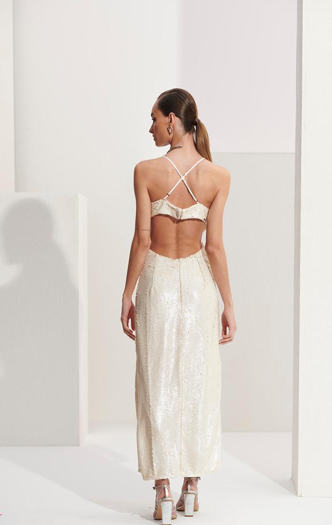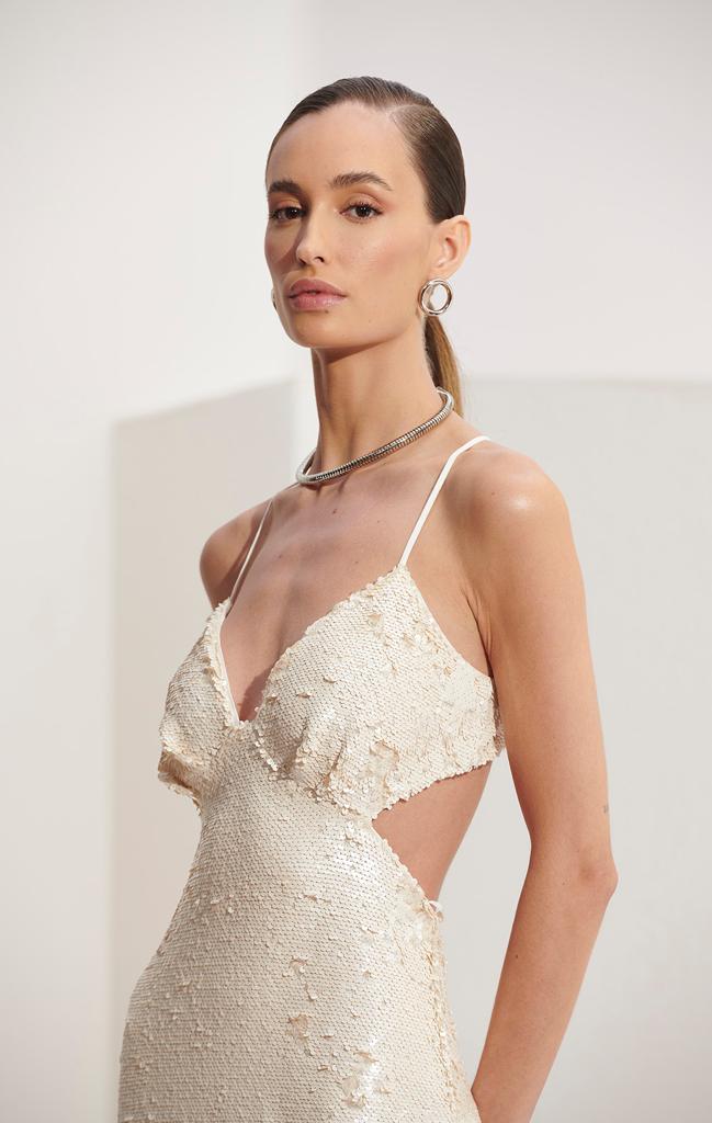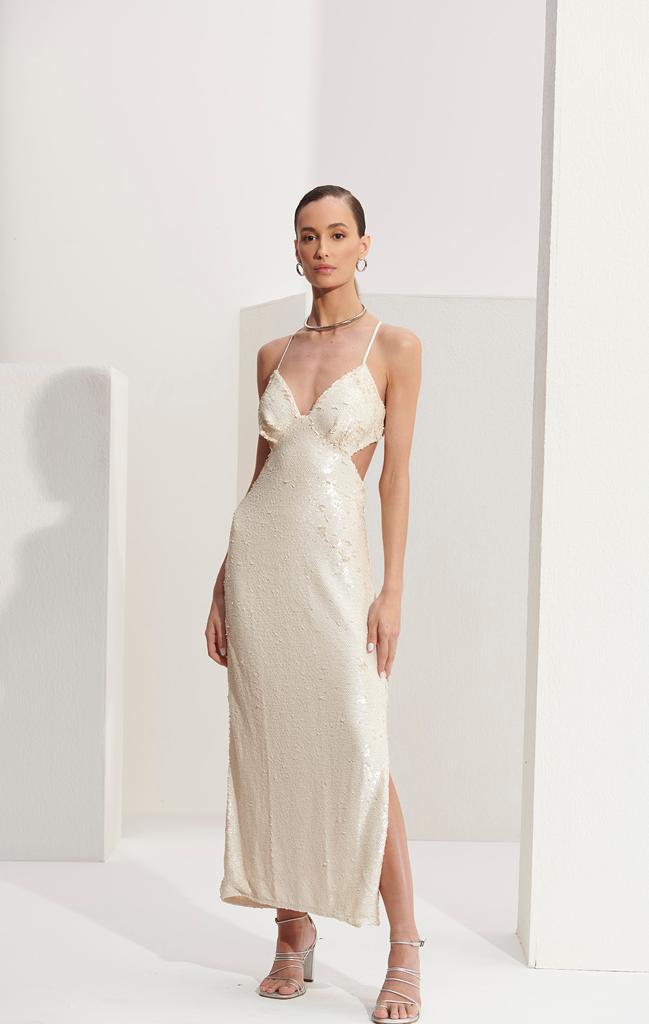 Vestido apresenta tecido paetê exclusivo da coleção Verão23, decote V, alças finas reguláveis, fecho em ganchos e zíper semi invisível embutido, detalhe de costas aberta, cut out, comprimento midi e fenda na barra.