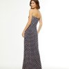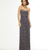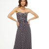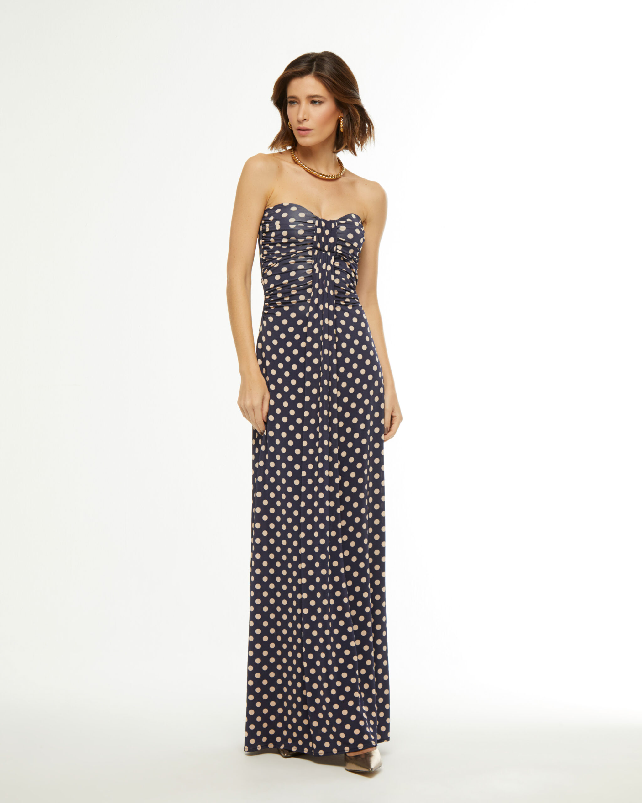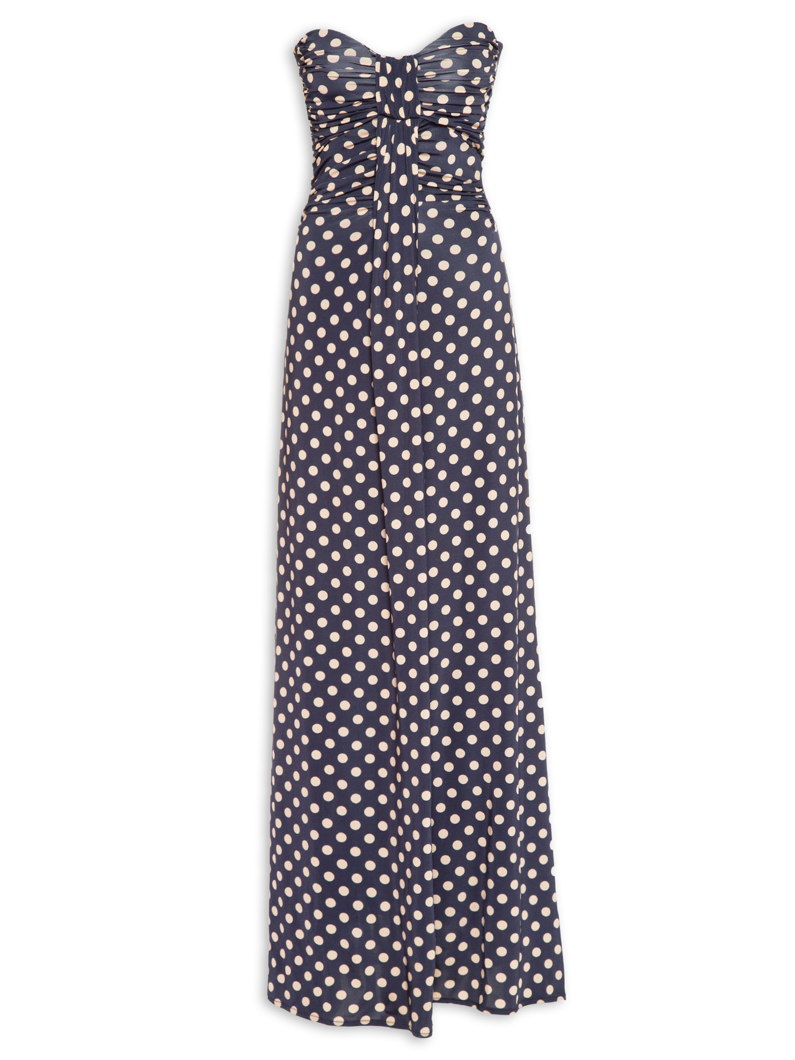 O vestido azul marinho é confeccionado em tecido leve. A peça de modelo tomara que caia possui decote meia taça, recorte na altura do busto sobreposto, detalhe de franzido na parte frontal na altura do busto e da cintura, forro, estampa de poá em cor contrastante, comprimento longo, shape solto, caimento reto, acabamento pespontado e fechamento posterior por zíper invisível.