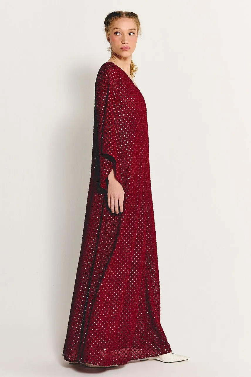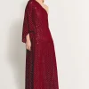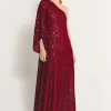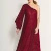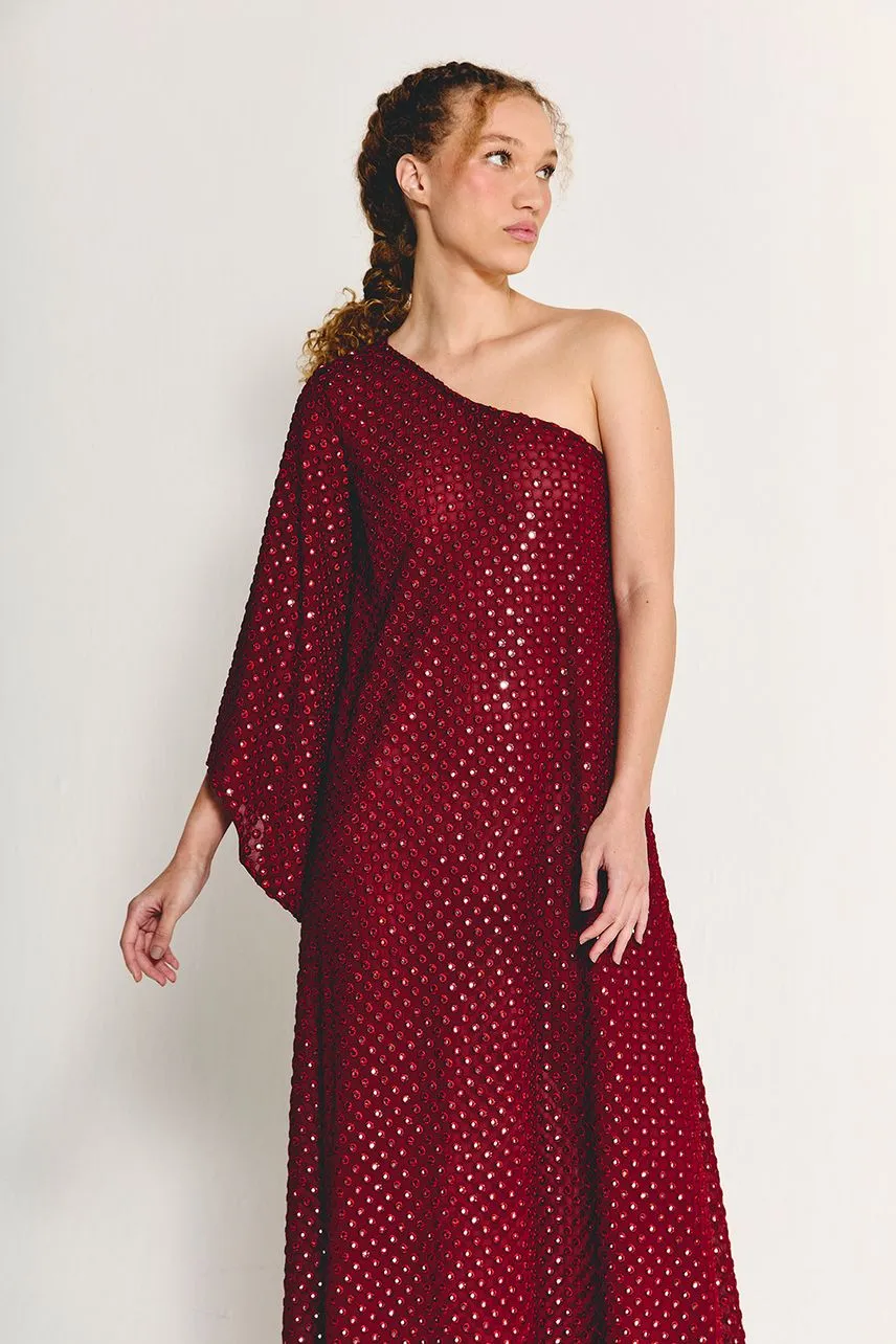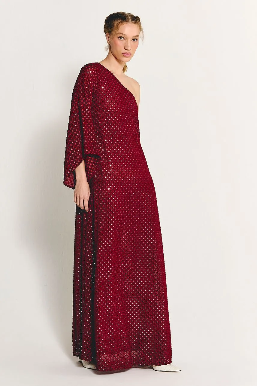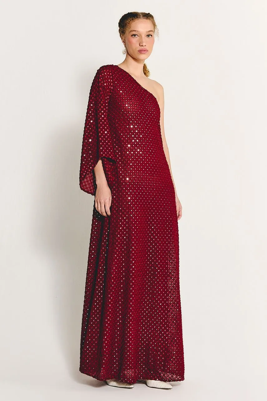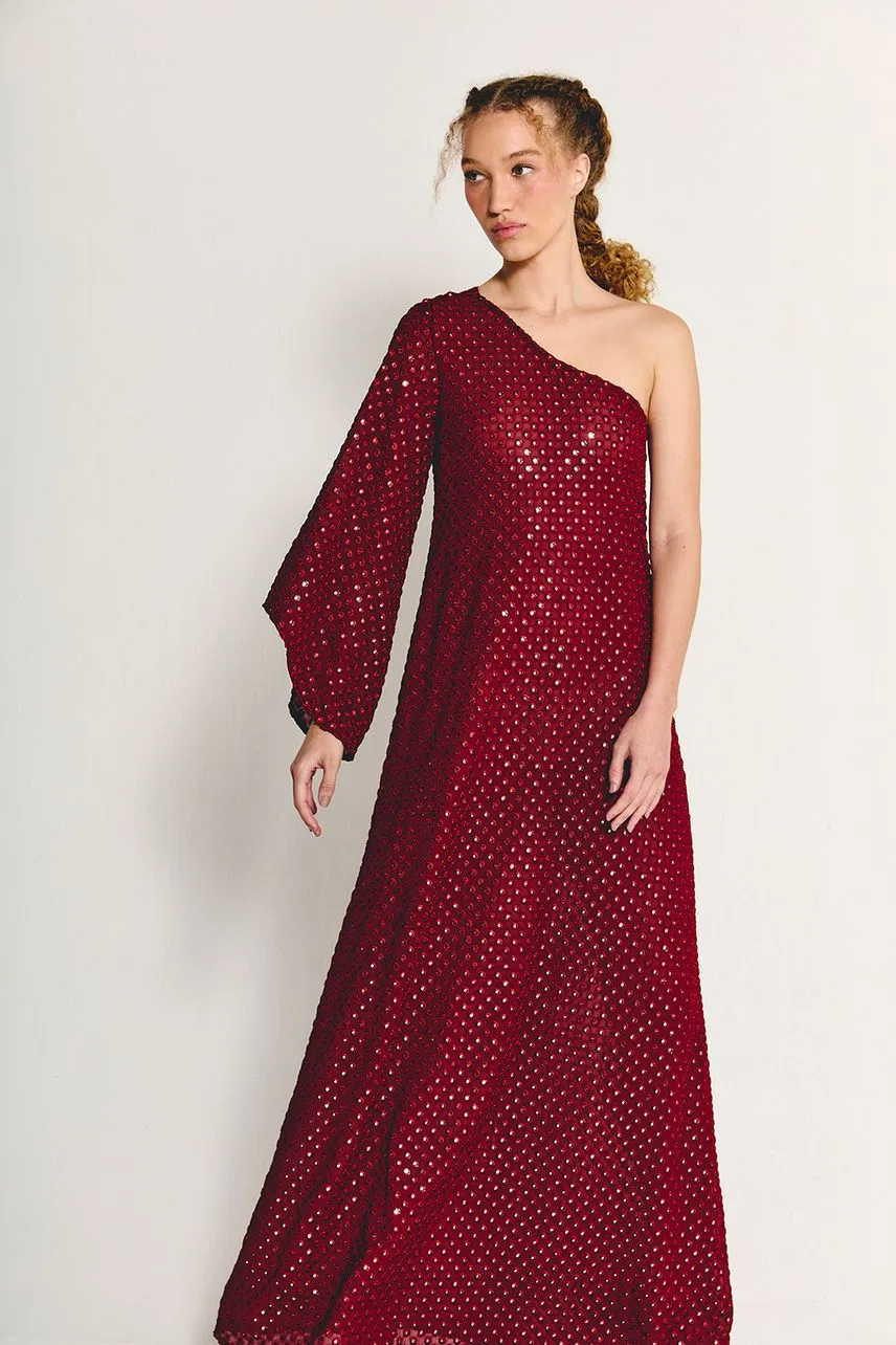 Vestido longo em tecido bordado especial com modelagem regular e ombro único. Possui fechamento lateral por zíper.