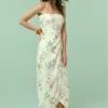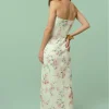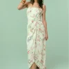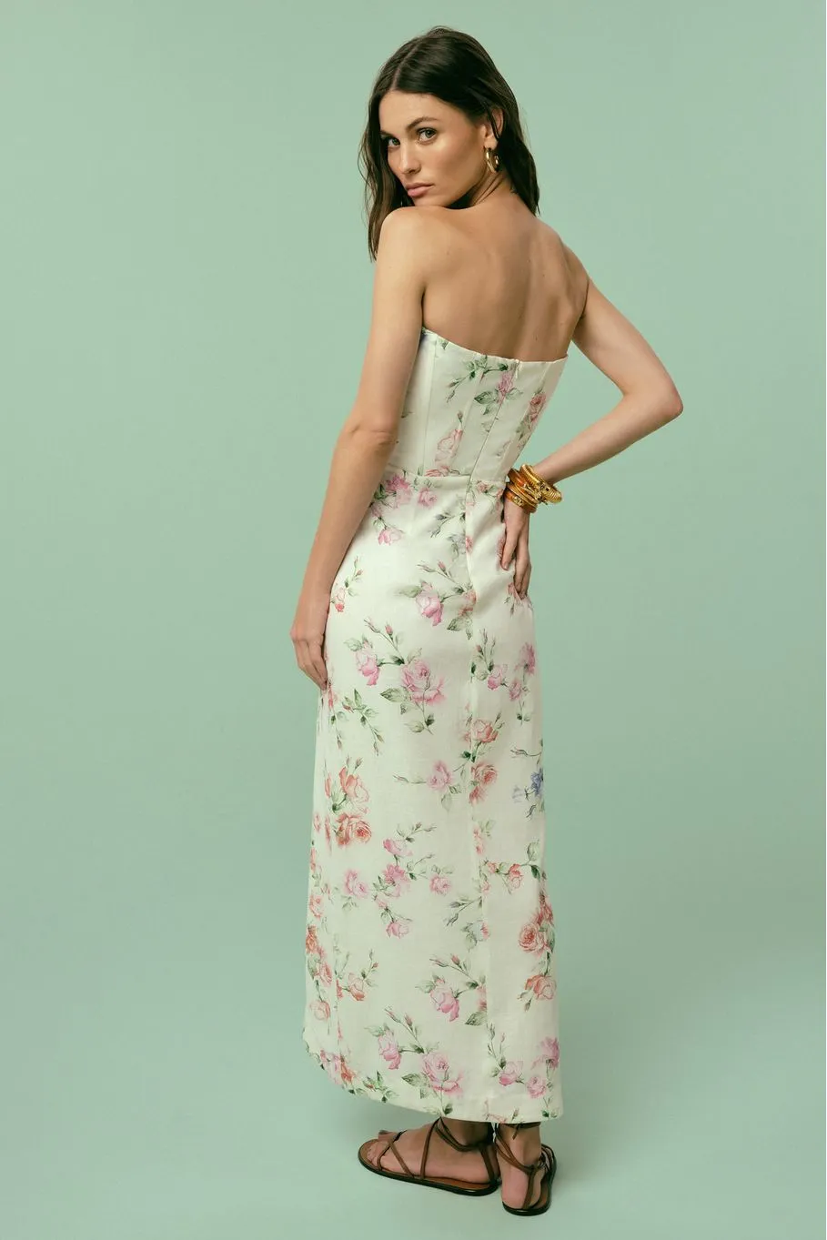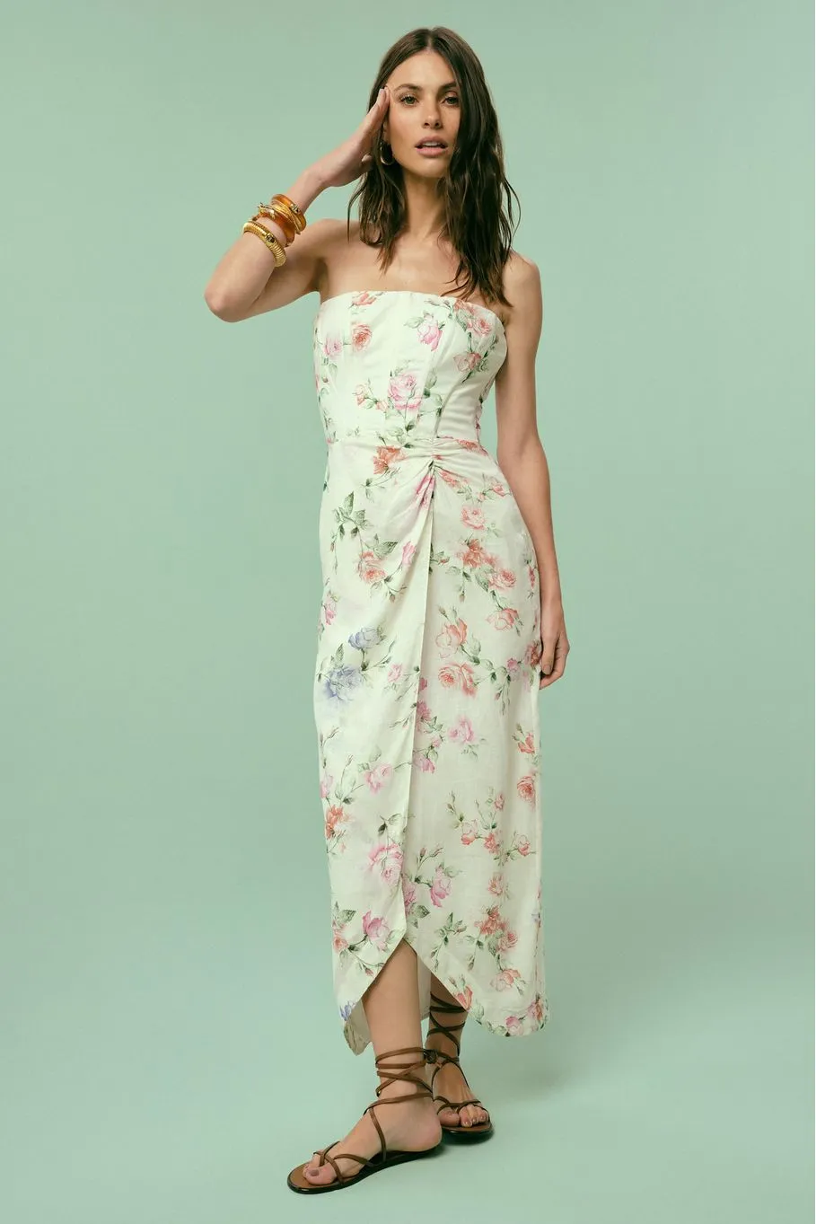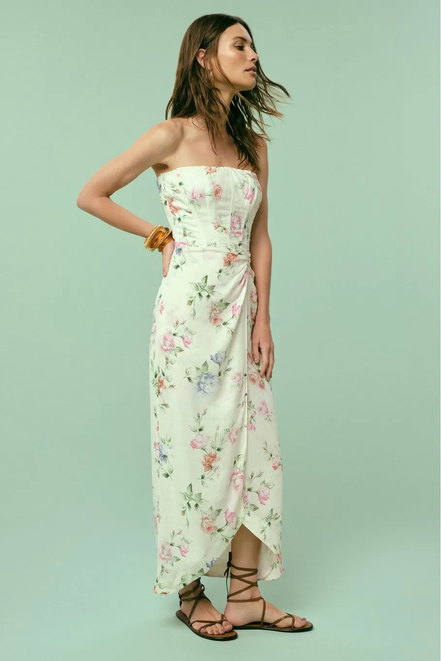 O vestido Sara é confeccionado em linho. A peça com estampa floral apresenta modelagem justa com barbatanas superior e saia transpassada inferior, proporcionando um visual romântico e clássico. Possui comprimento midi, decote reto e zíper invisível posterior.