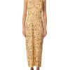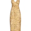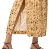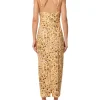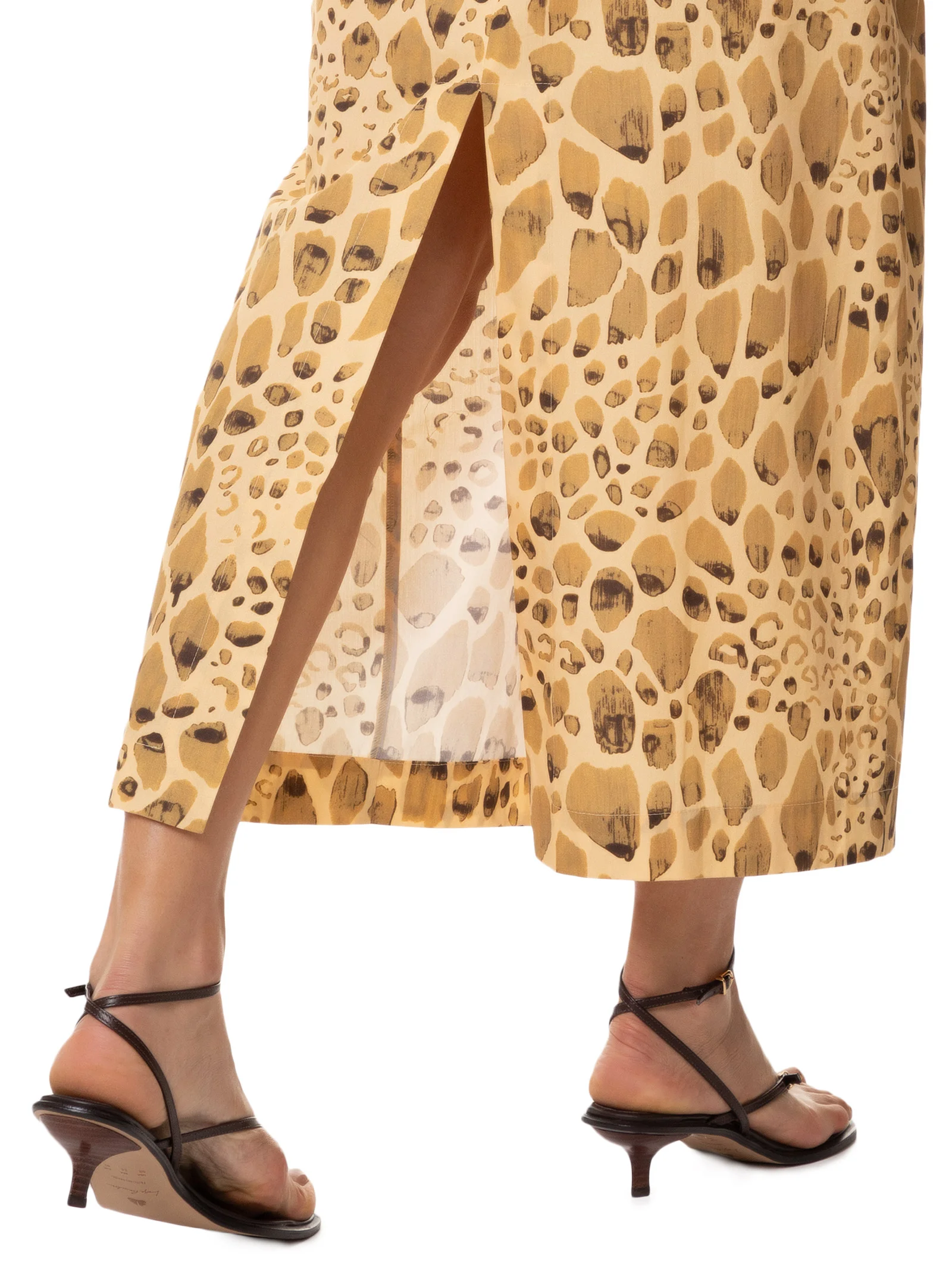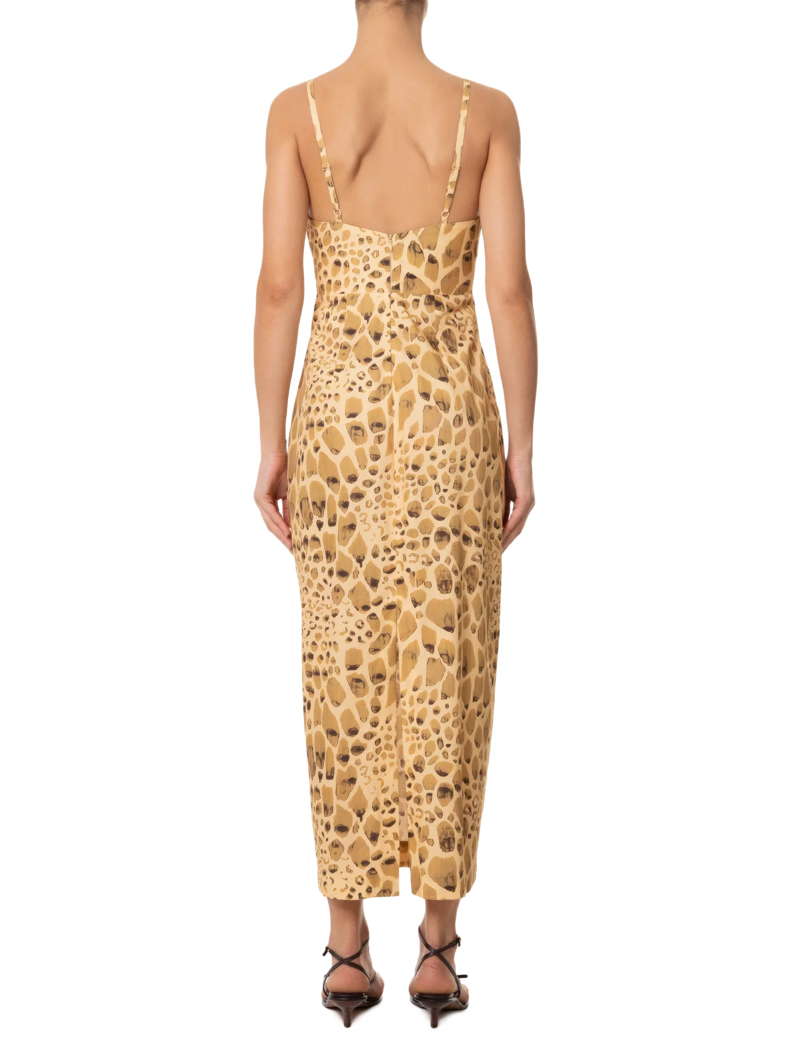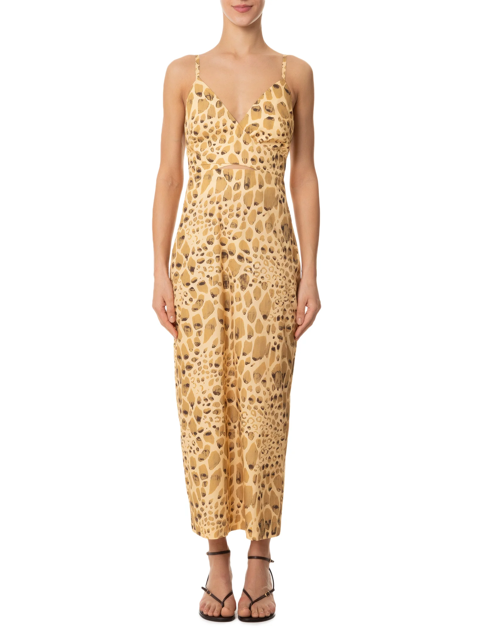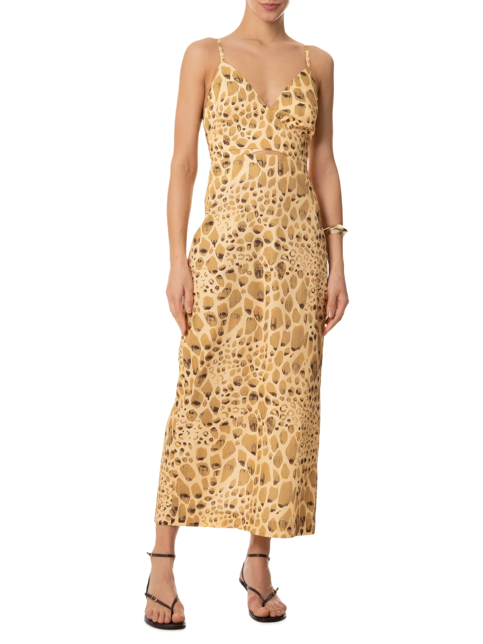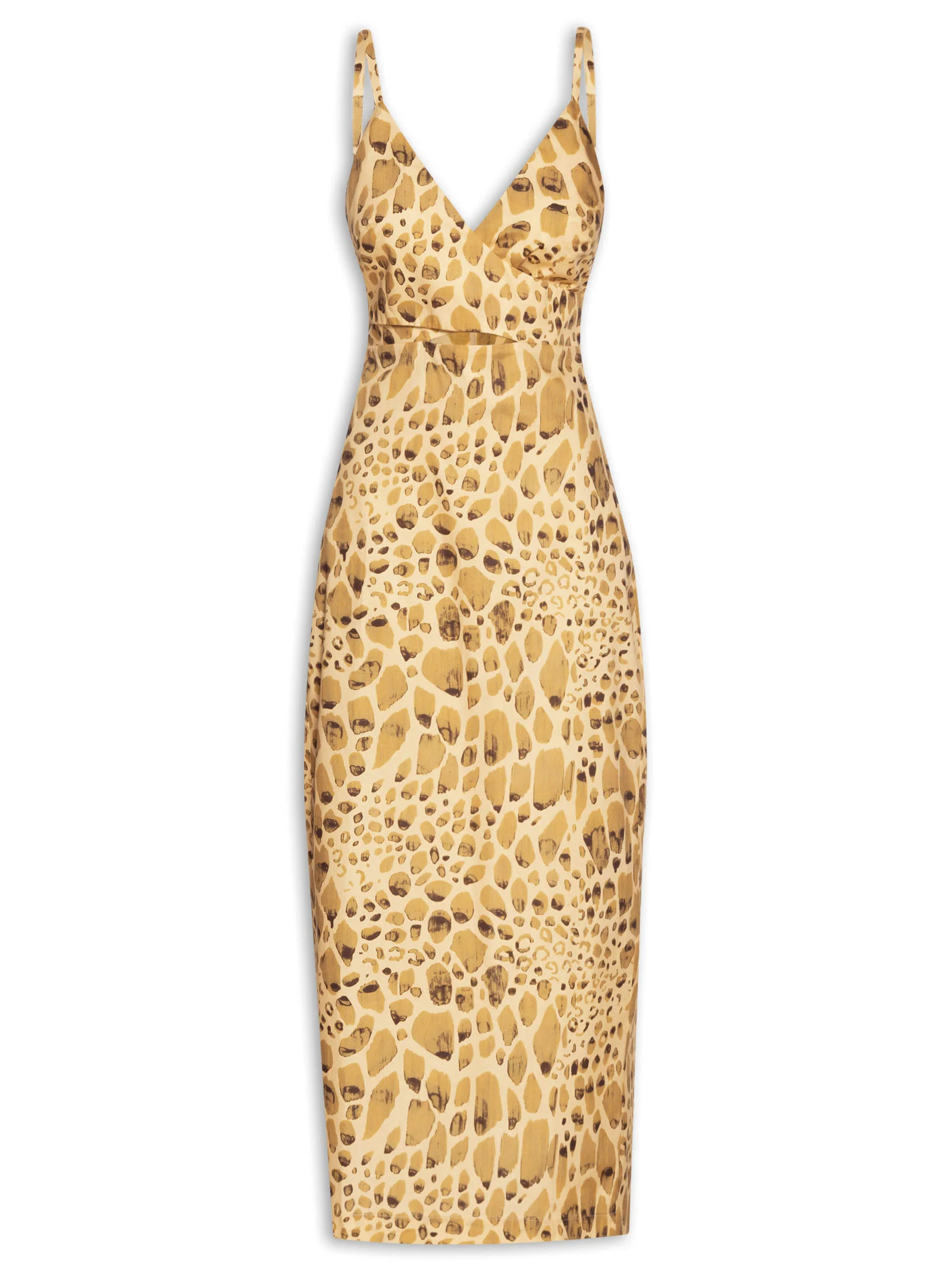 O vestido amarelo é confeccionado em tecido leve sem elasticidade. A peça justa ao busto e solta ao corpo, possui decote em V com transpasse frontal, alças finas com regulagem, recorte vazado frontal na altura da cintura, fenda posterior, estampa figurativa de pedras em cores contrastantes, comprimento midi e fechamento posterior por zíper invisível.